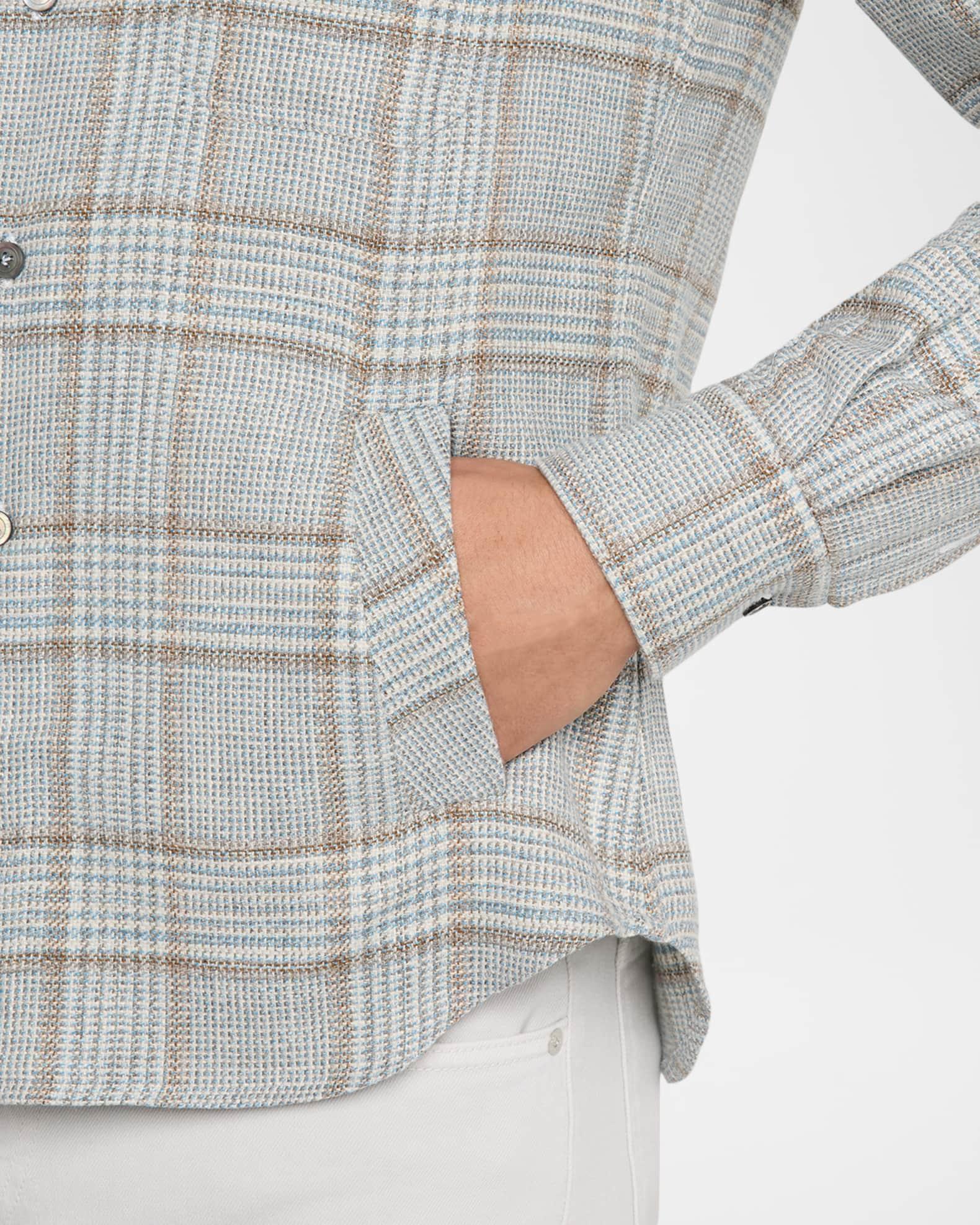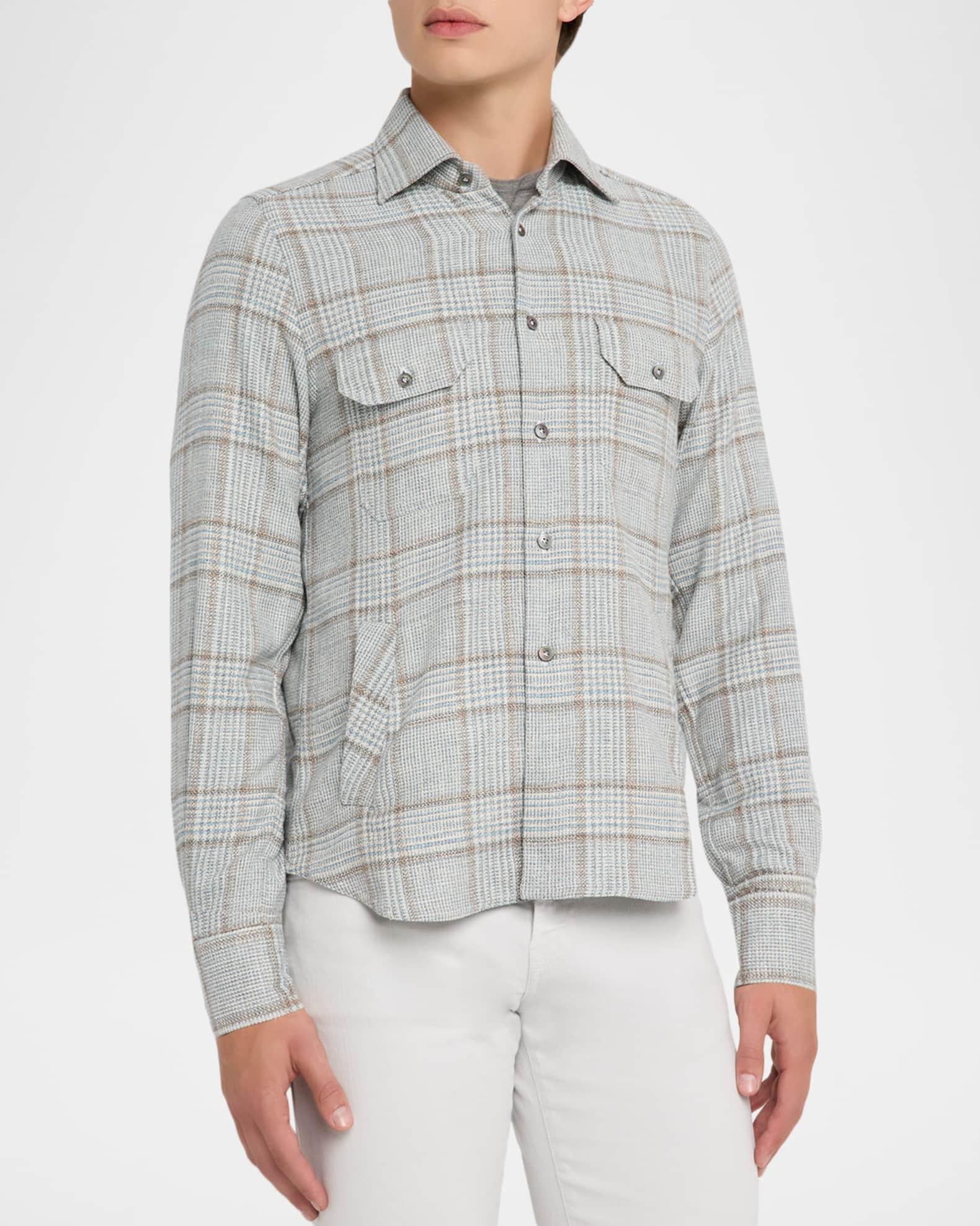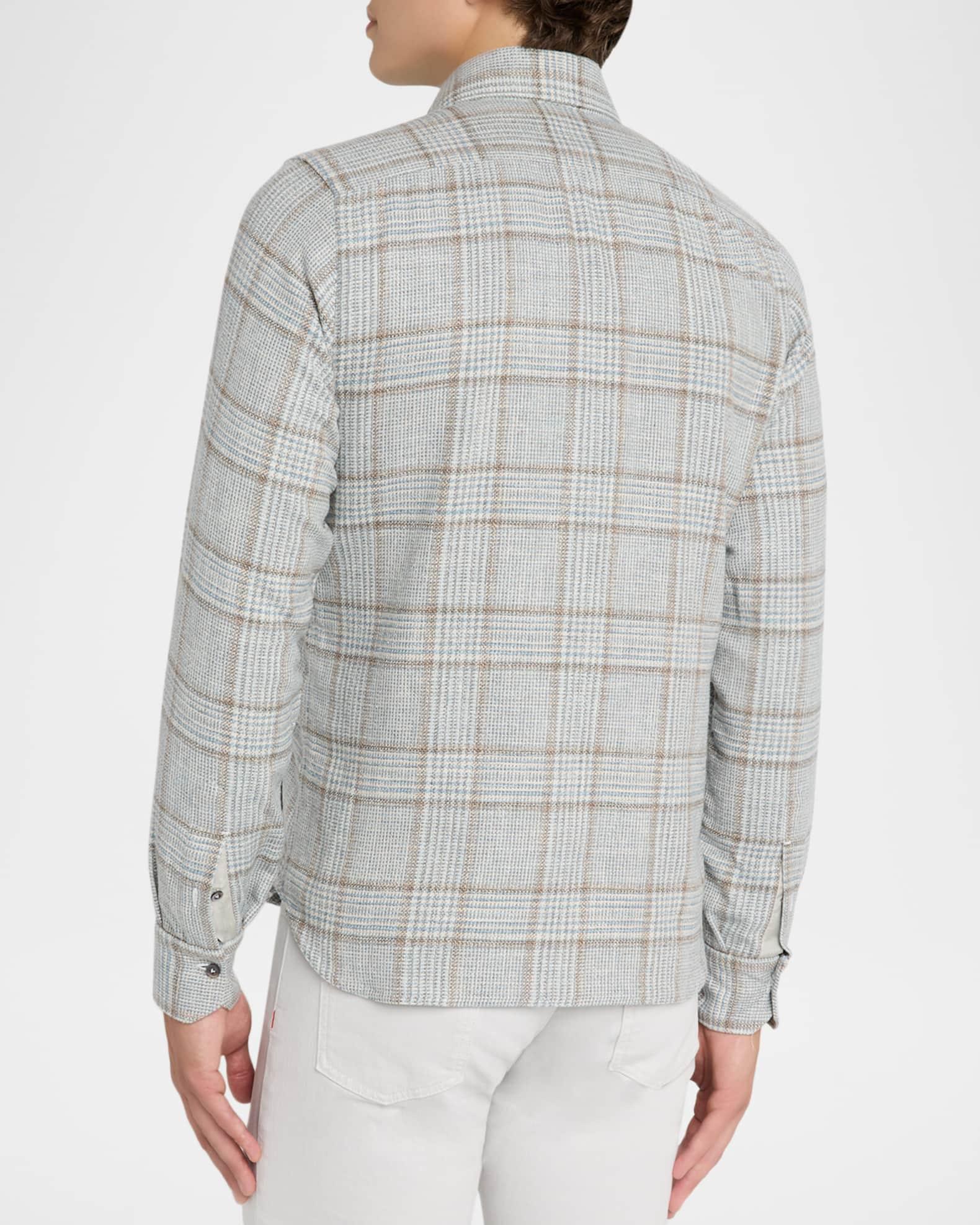 Kiton plaid overshirt in a luxe wool blend, elevated with genuine mother-of-pearl buttons Spread collar Button placket Chest flap pockets Side welt pockets Long sleeves Mitered barrel cuffs Back yoke Curved hem Classic fit Virgin wool/silk/cotton Unlined Dry clean Made in Italy