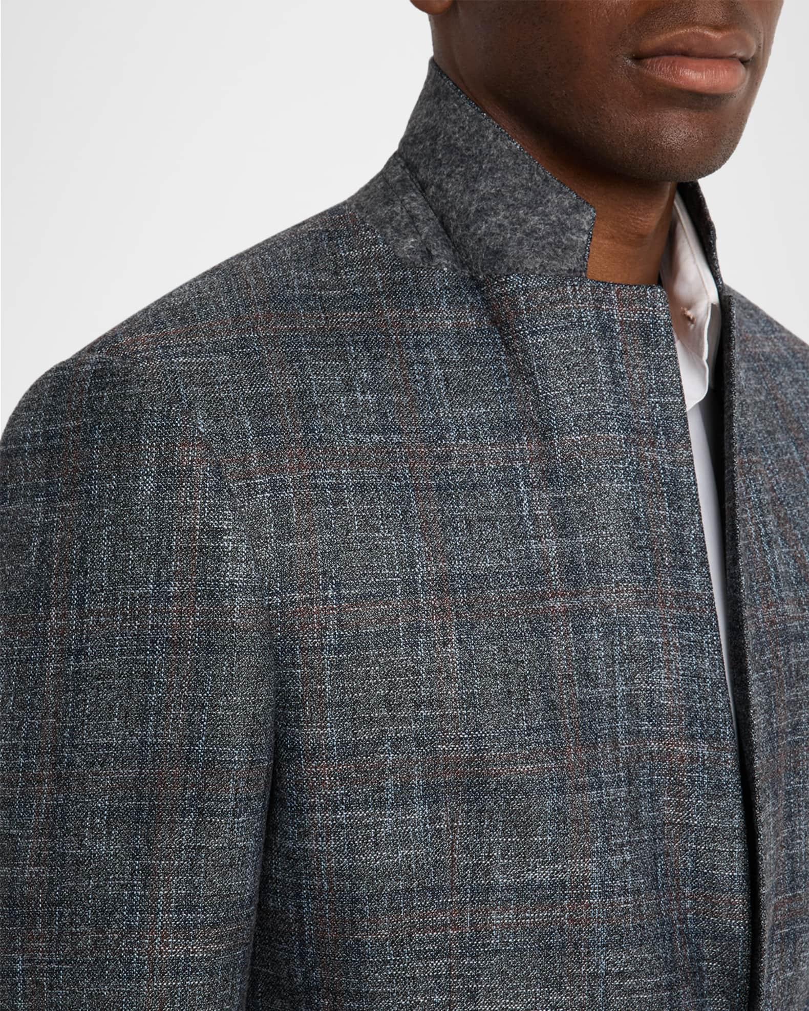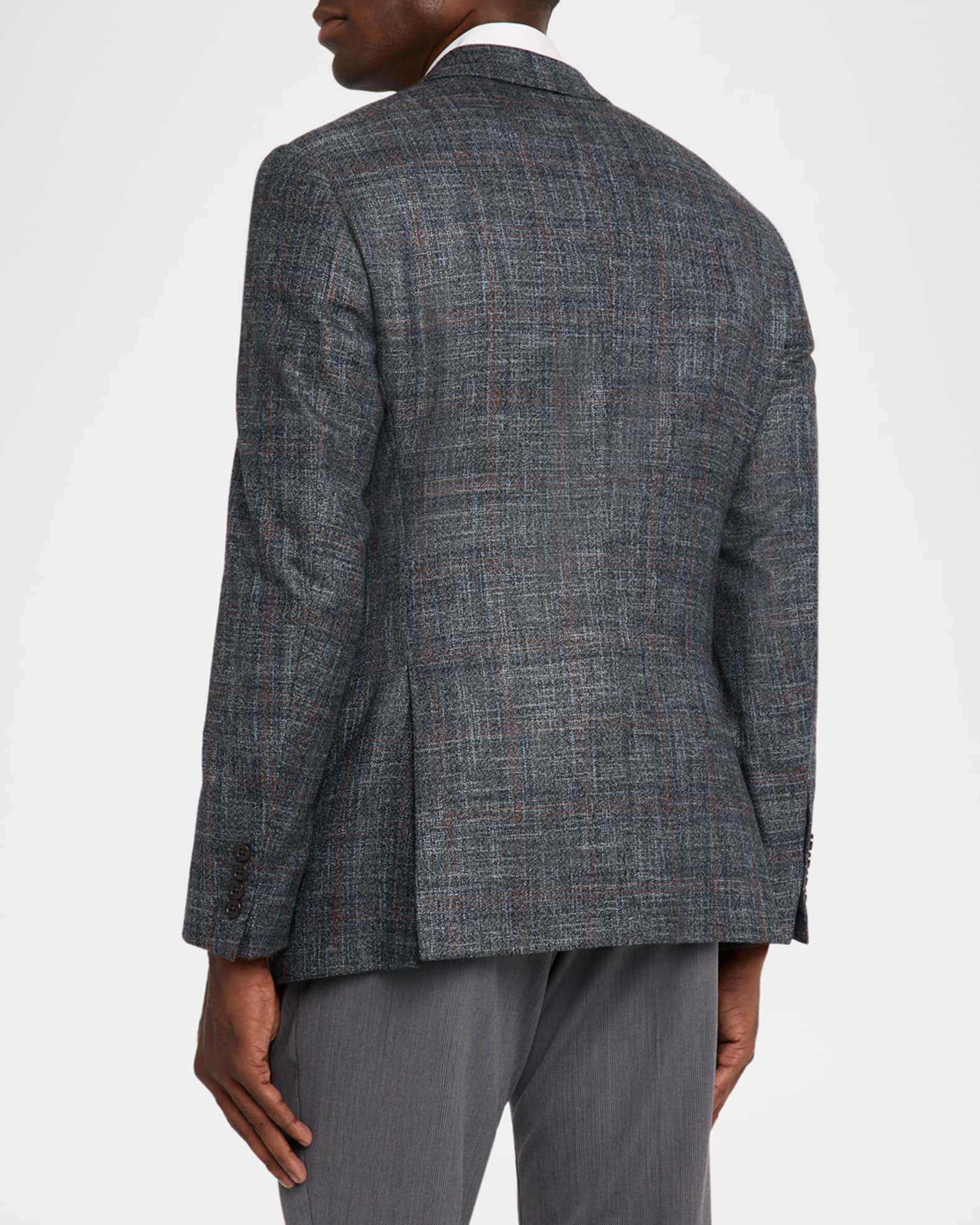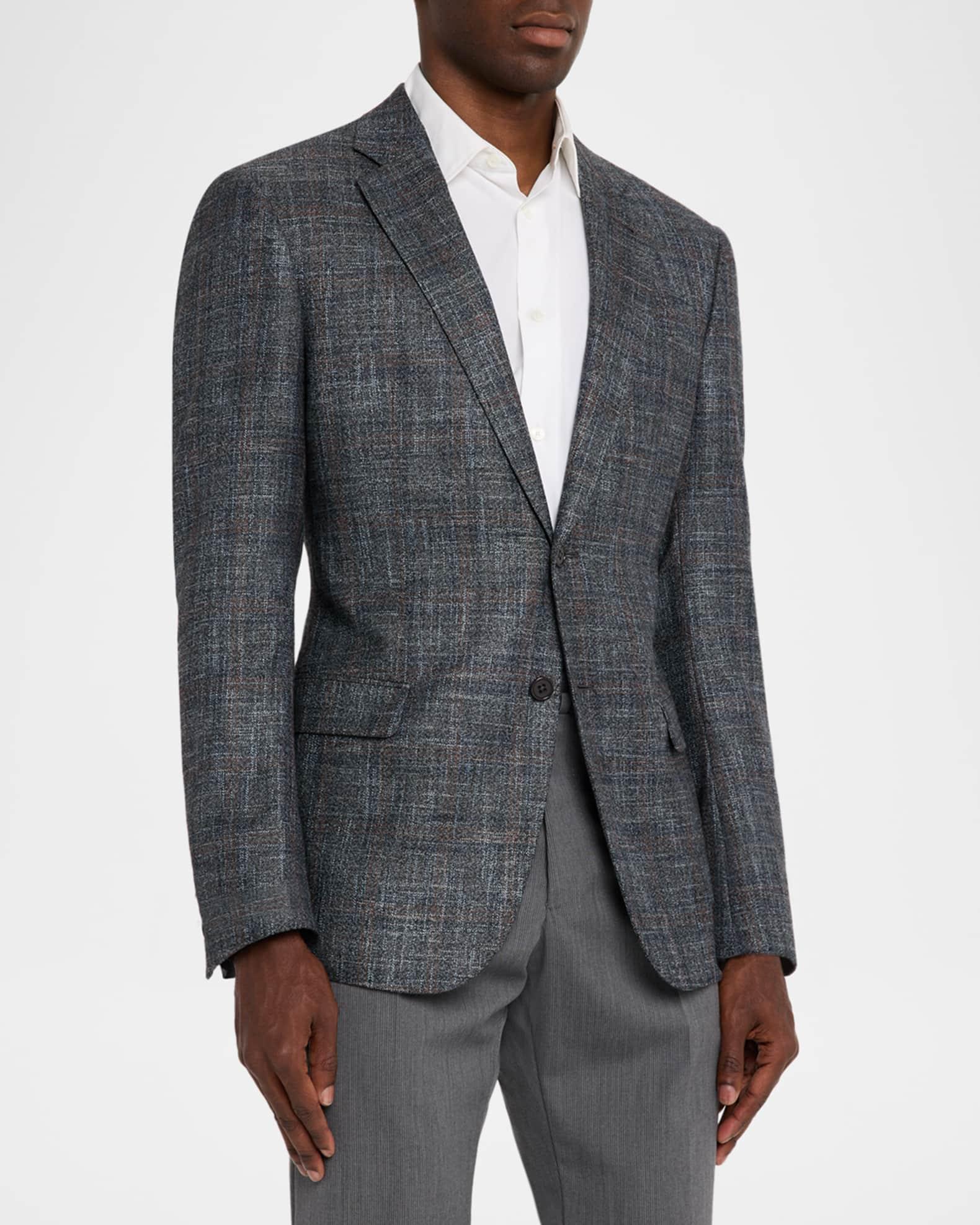 Emporio Armani sport coat from the G Line in premium virgin wool displaying a stylized faded plaid pattern Notched lapels Single-breasted front Chest welt pocket Hip flap pockets Long sleeves Four-button cuffs Double-vented back Virgin wool/viscose Dry clean Imported