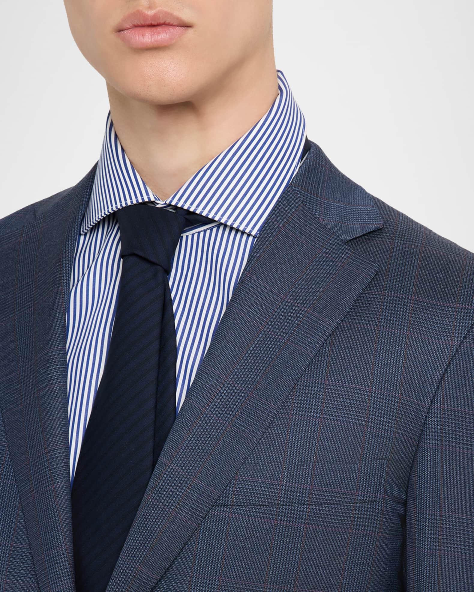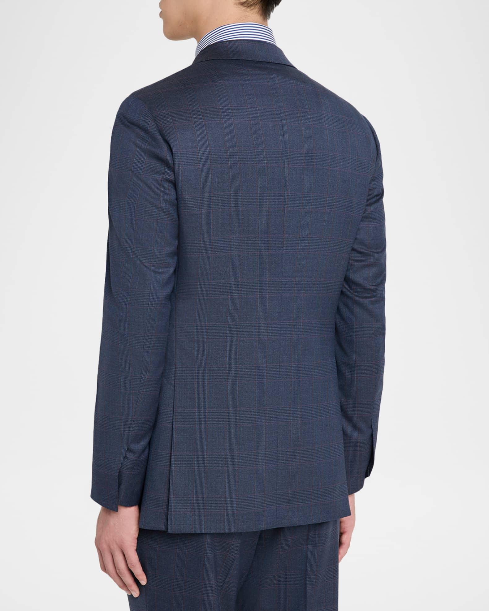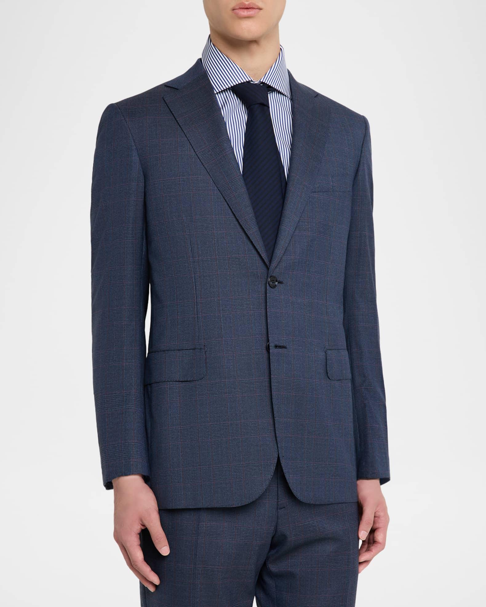 Brioni two-piece suit in wool highlighted with a windowpane plaid check Tailored fit Wool Dry clean Made in Italy Jacket: Notched lapels Single-breasted front Chest welt pocket Hip flap pockets Basted sleeves Double-vented back Pants: Regular rise Flat front Side slip pockets Straight legs Unfinished hem to be tailored to desired length