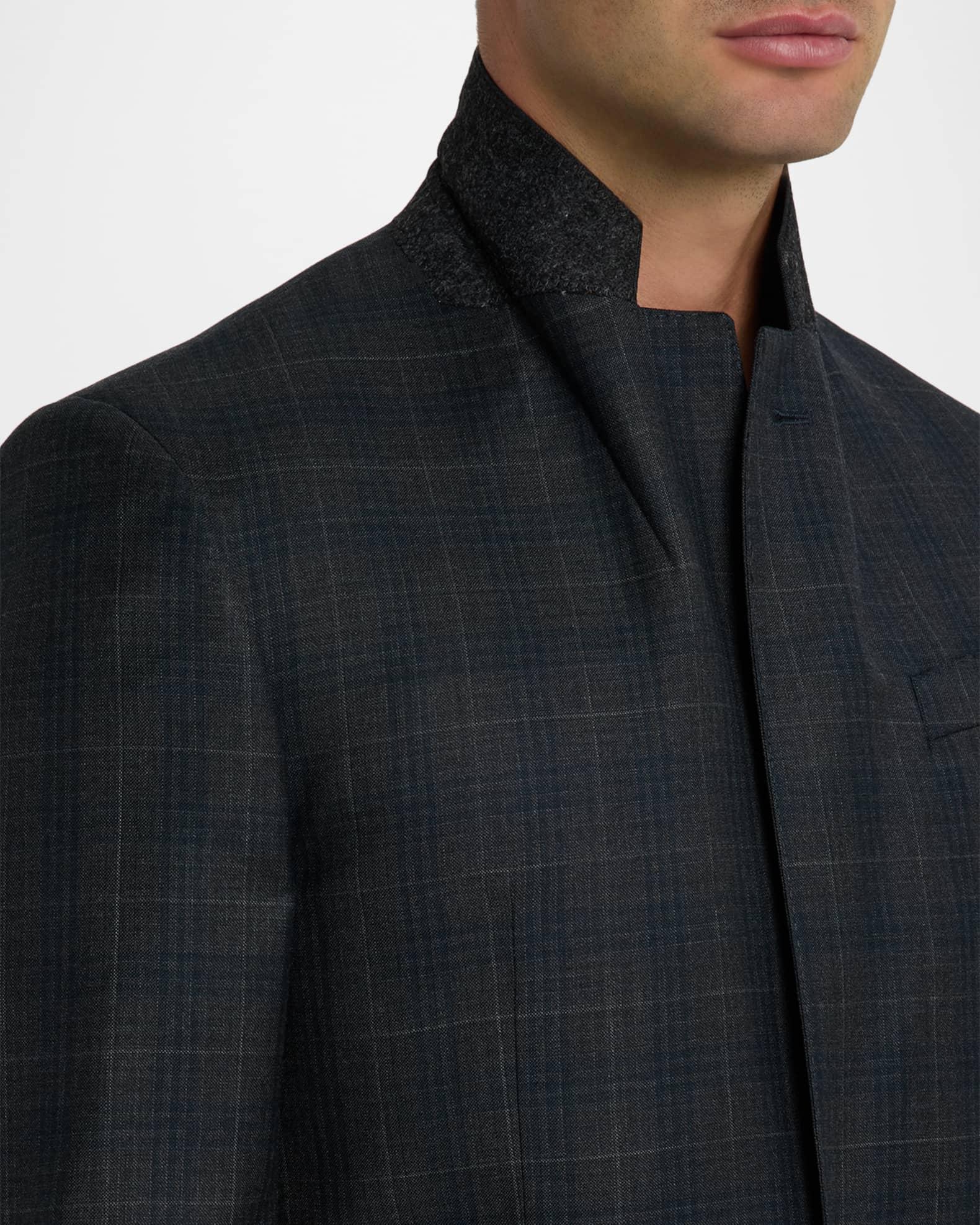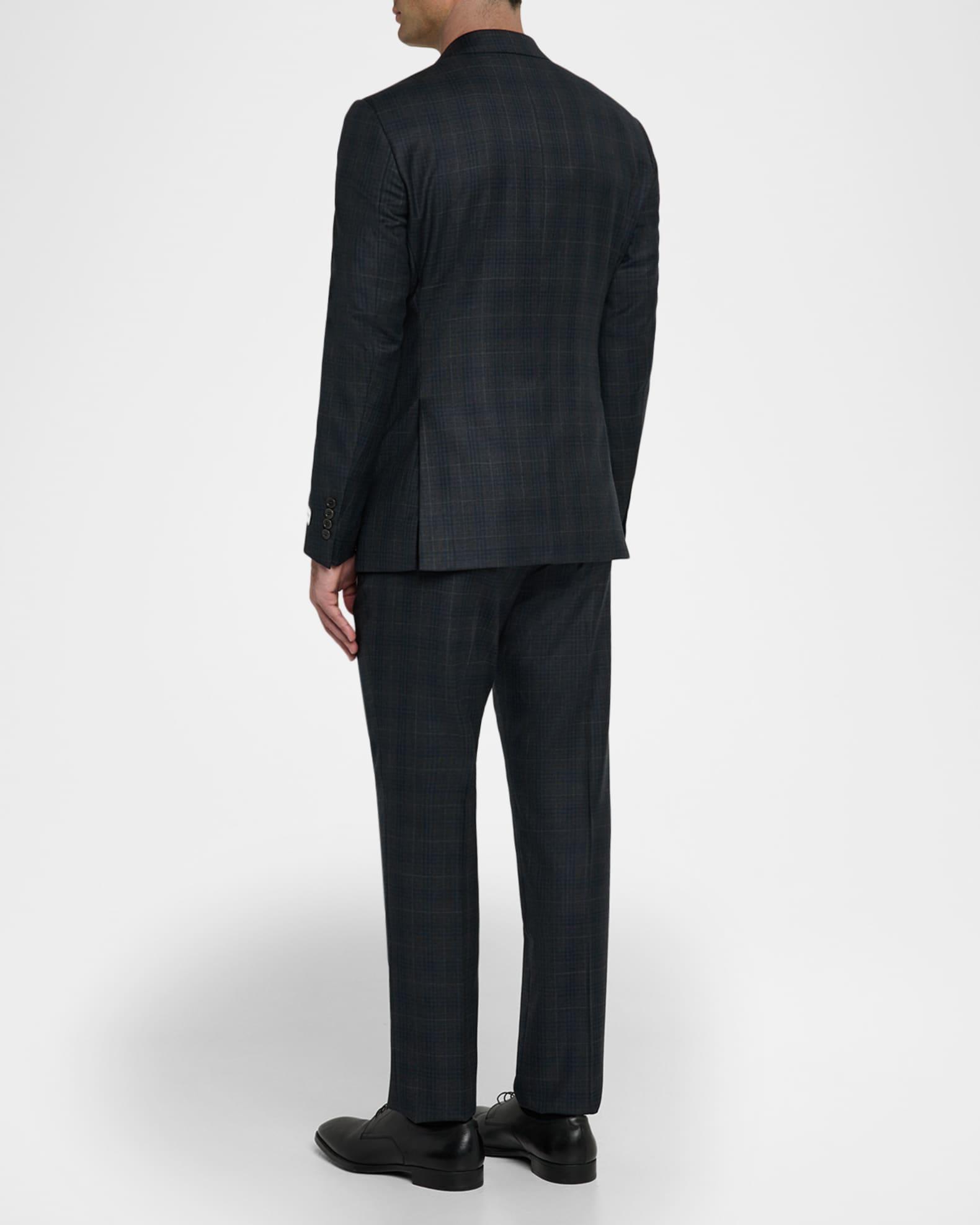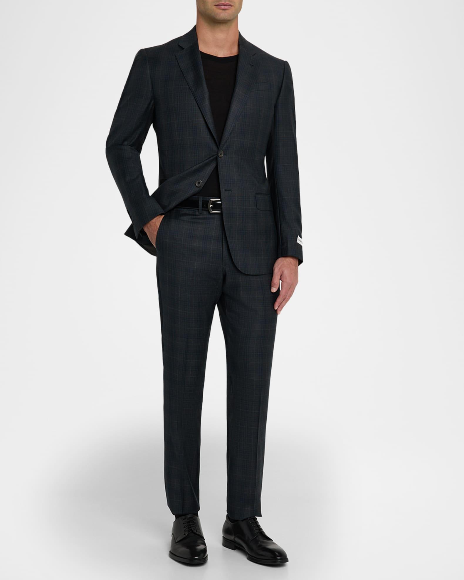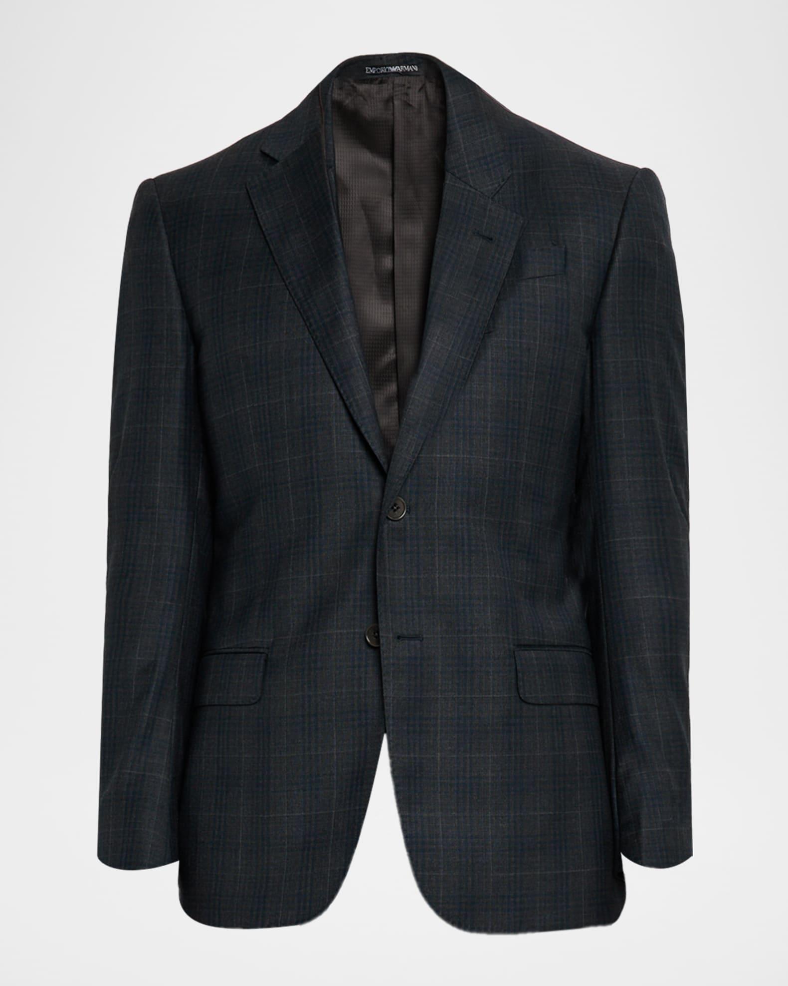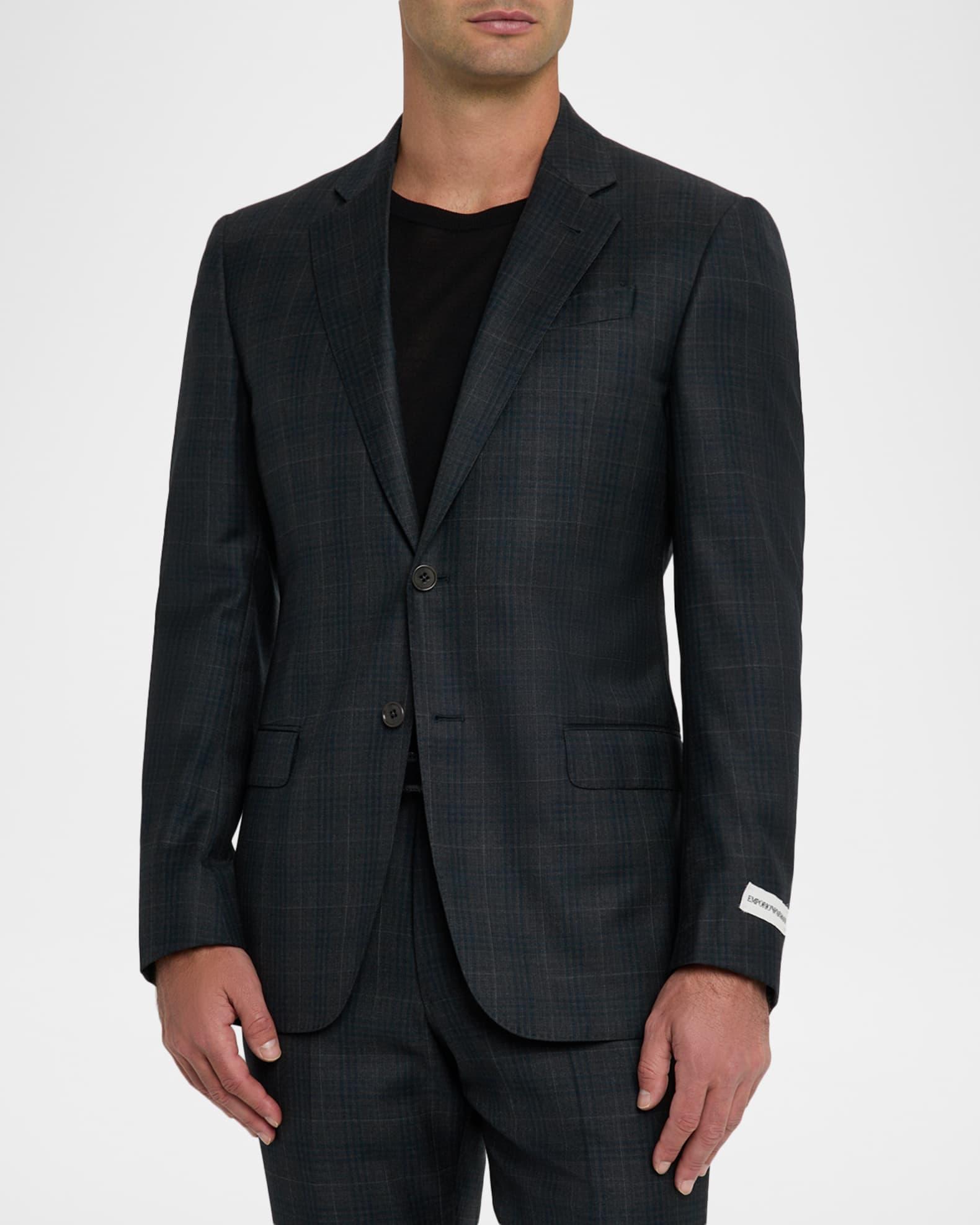Emporio Armani plaid two-piece suit in Super 130's wool for a balance of softness and durability G line Virgin wool/viscose Dry clean Imported Jacket: Notch lapels Chest welt pocket Internal breast pocket Hip flap pockets Four-button cuffs Double-vented back Pants: Regular rise Flat front Side slip pockets Straight legs Extended button-zip front; belt loops Unfinished hem to be tailored to desired length