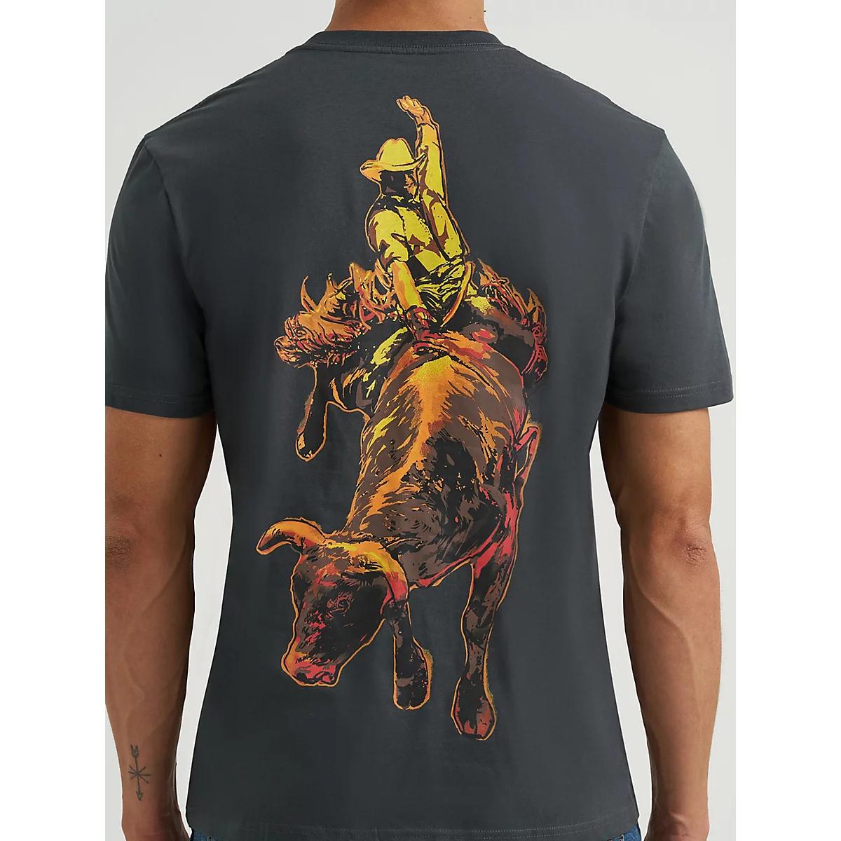 BUCK UP YOUR T-SHIRT COLLECTIONEvery move you make on the back of a bucking bronco has to count. Start rodeo season off on the right foot with our screen-printed short-sleeve t-shirt. Inspired by one of the roughest sports in rodeo, this men's tee comes with a splattered design of a saddle bronc riding pro in his element, showing what it takes to last eight seconds on the back of a formidable opponent. It also comes with the official Wrangler® logo for a stamp of authenticity.