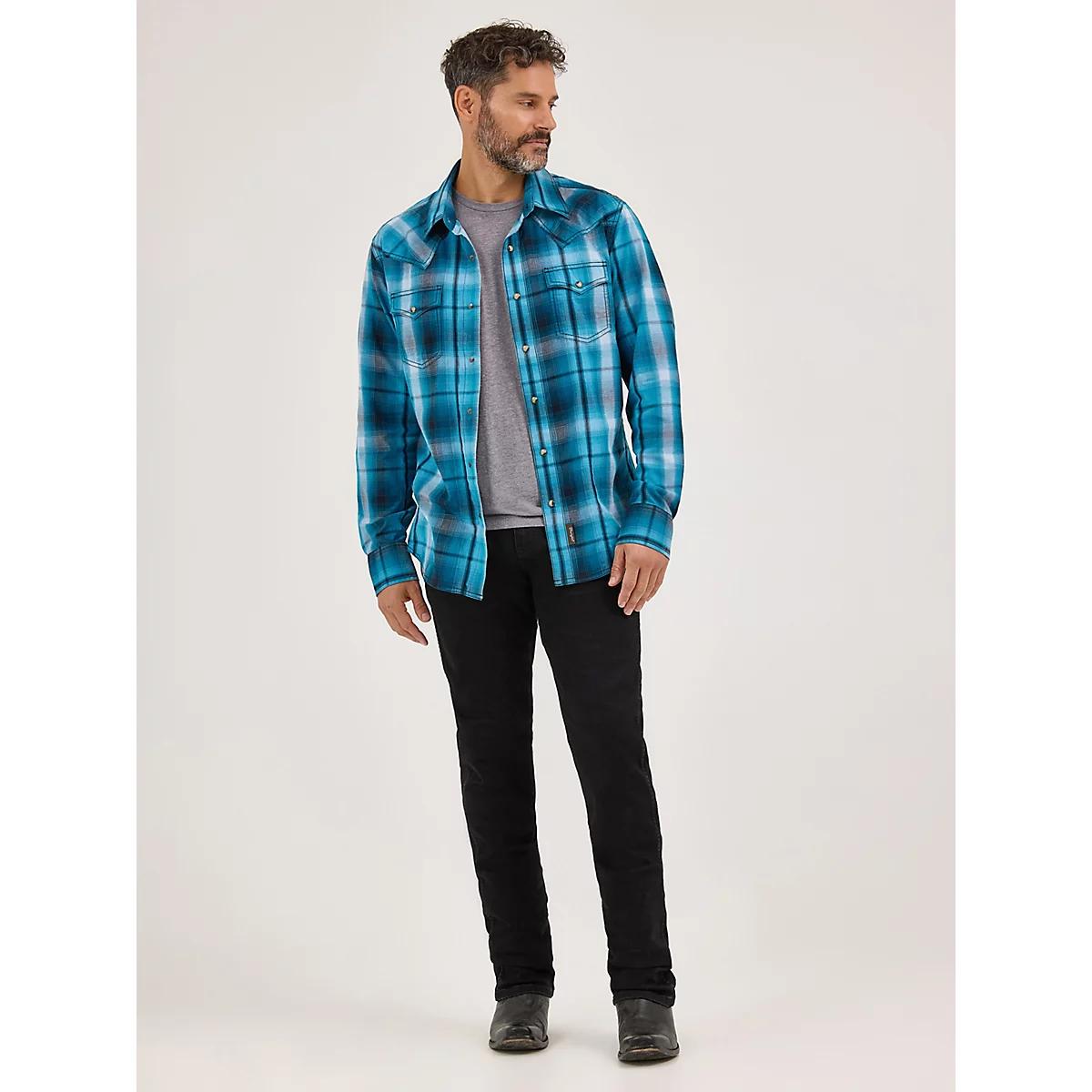 CLASSIC WRANGLER, MADE MODERNOur men's Wrangler Retro® Premium long-sleeve western snap plaid shirt delivers all the authentic western styling you love but with a modern fit that's perfect for the contemporary cowboy. It's crafted from cotton for all-day comfort and long-lasting durability. Plus, it features pointed front and back yokes, contrast trim, snap cuffs, and a full snap closure. You can easily wear this long-sleeve snap shirt all year long, and it looks great layered over a white t-shirt. Complete the look with your favorite pair of Wrangler Retro bootcut or slim-fit jeans.