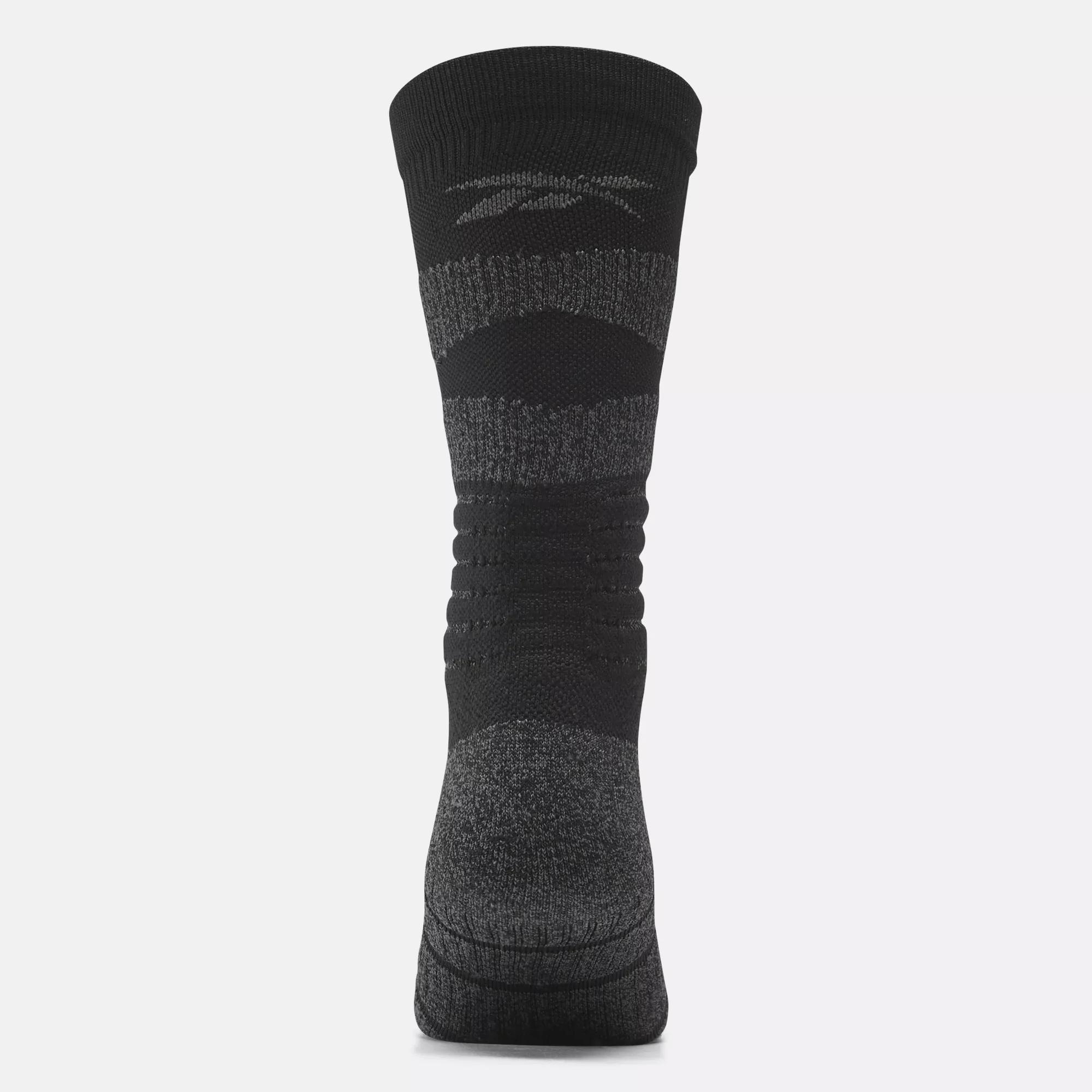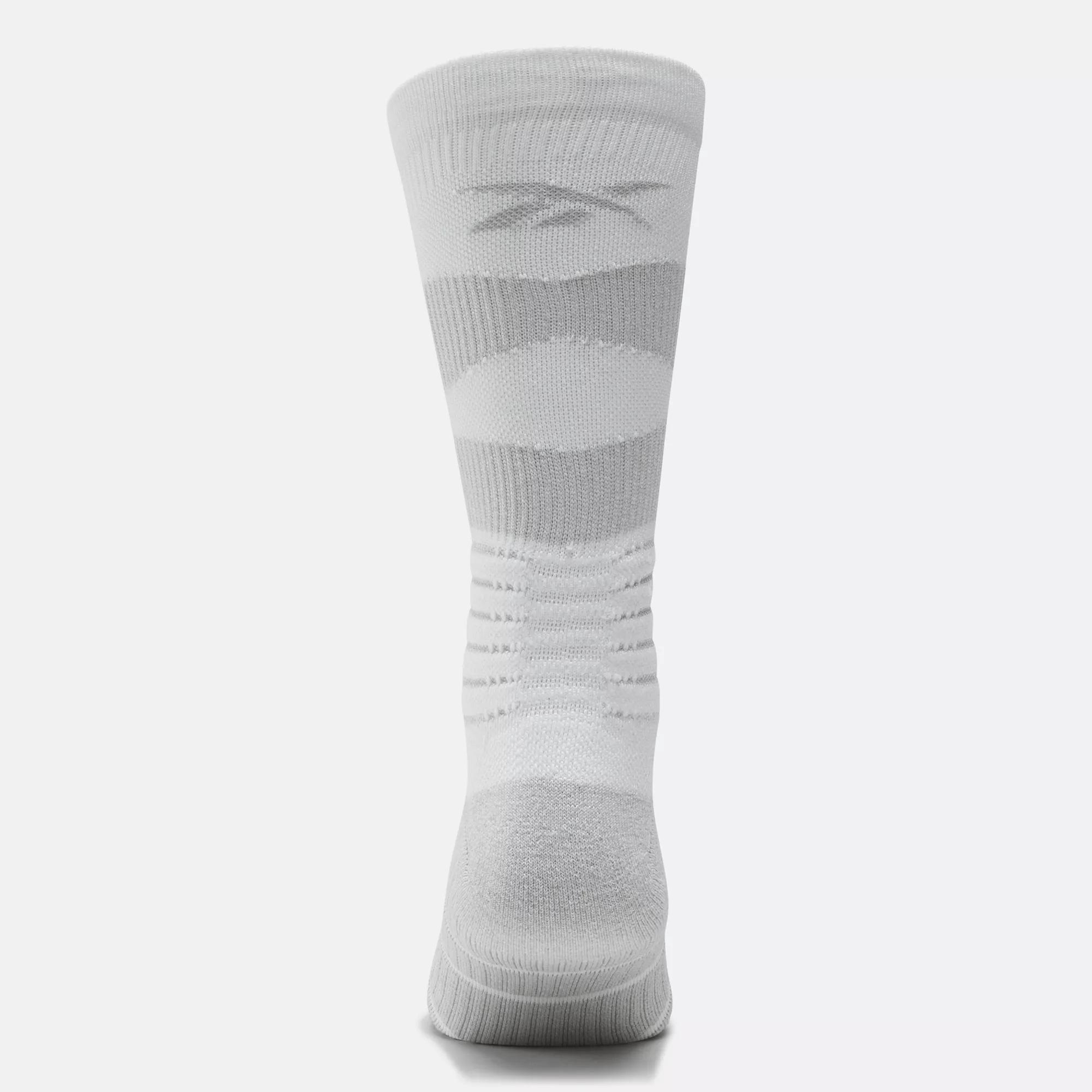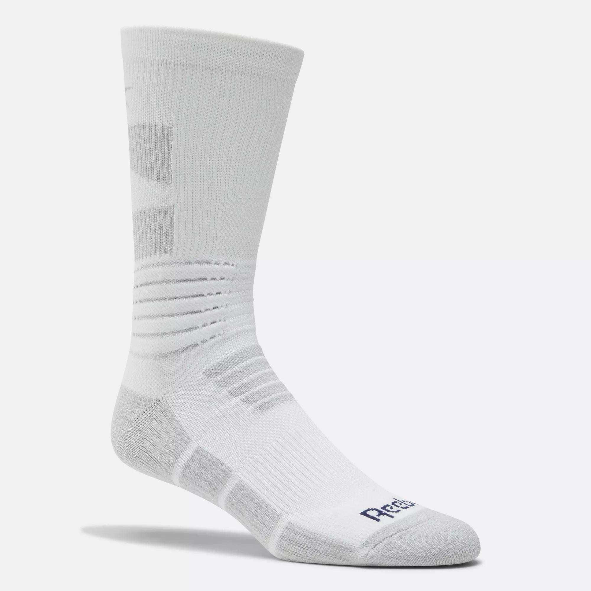 Basketball socks with a cushioned footbedRaise your hoops game in these men's Reebok crew-length socks. Designed for putting up shots and pulling down rebounds, they're made of stretchy, moisture-wicking yarn. Knit-in arch support keeps you going until the final buzzer.