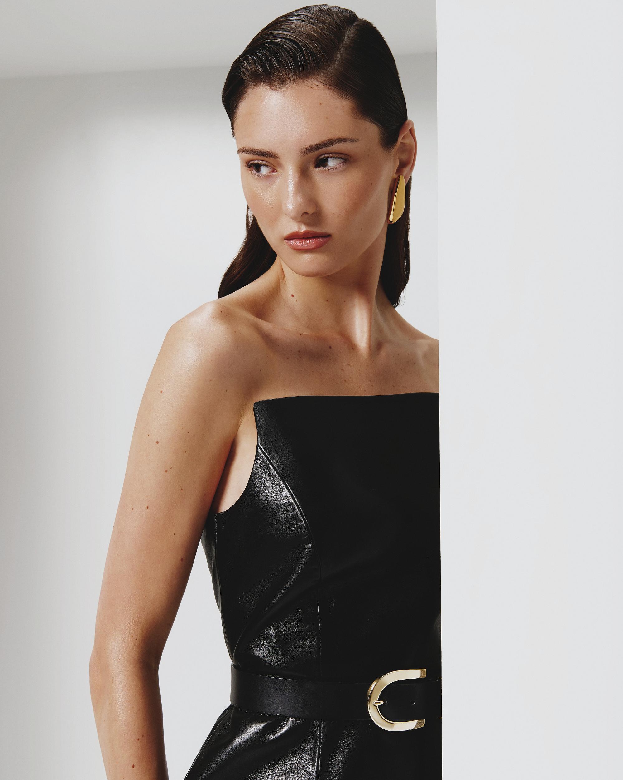 18k gold plated brass irregular shaped buckle and detailed tip. Secured on a smooth buffed leather strap.