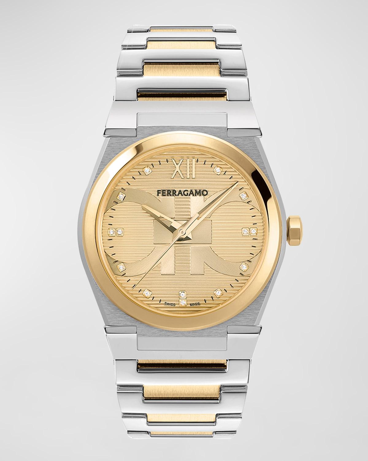 From the Vega Capsule Collection. Crafted of stainless steel, FERRAGAMOs Vega Timepiece is enriched with diamonds on its branded blue guilloch dial. A two-toned bracelet with a deployant buckle completes this piece. Quartz movement Fixed bezel Sapphire crystal Screw-down crown Gold guilloch dial Diamond hour markers (0.06 tcw) Second hand Stainless steel case and bracelet Deployant buckle Two-year warranty and two-year extension Made in Switzerland FEATURES Water resistant to 3 ATM SIZE Round case, about 40mm (1.57) Bracelet, about 17mm (0.67) ABOUT THE BRAND Italian designer Salvatore Ferragamo began his journey in 1927 with a vision of creating the worlds most beautiful shoes. The label expanded to menswear in the 1970s, and remains famed for its made-in-Italy pieces. The craftsmanship inherent in its shoes is also found in accessories like sunglasses, belts and ties. The brands signature Gancini logo-a backwards horseshoe-can be found on its classic loafers and fine leather goods. Men Accessories - Watches And Gifts > Ferragamo > Saks Fifth Avenue > Barneys. FERRAGAMO. Color: Two Tone Gold.