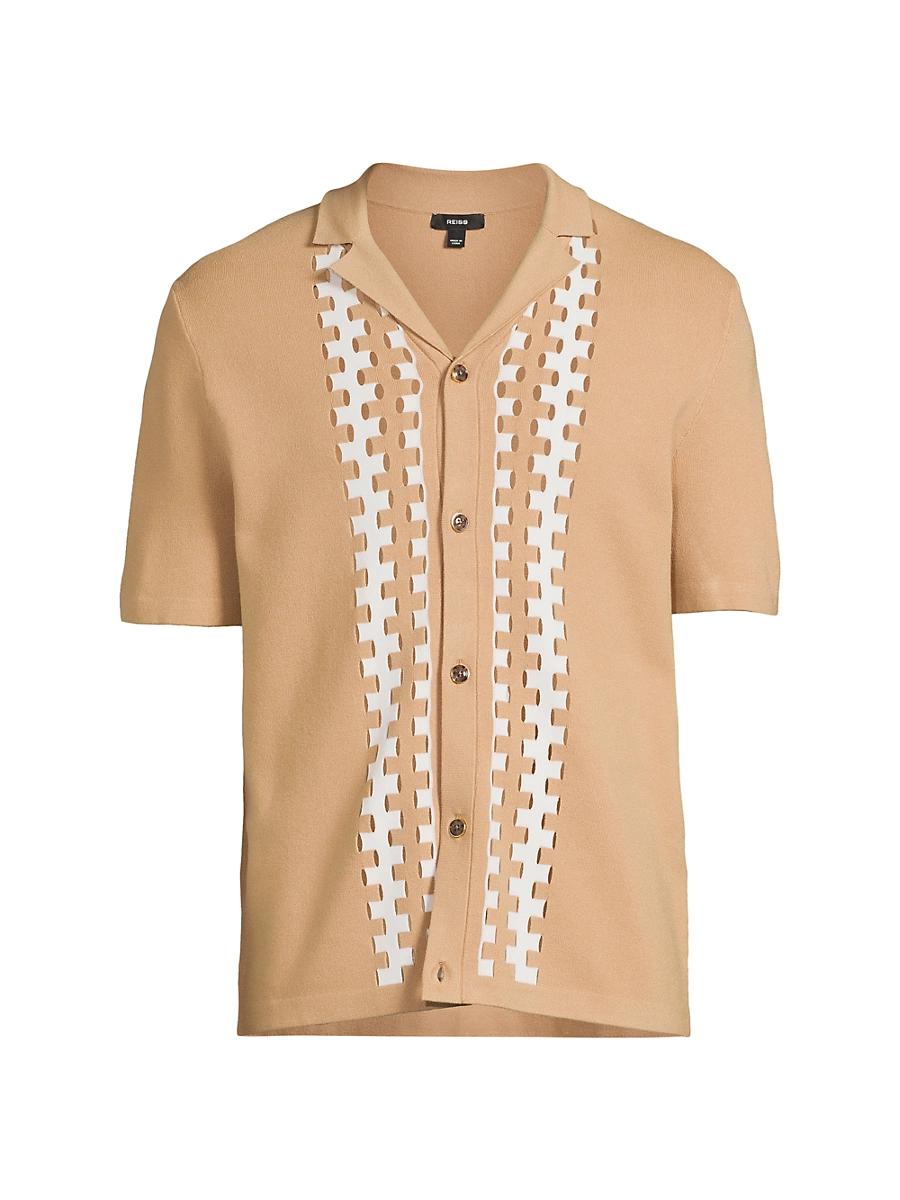 The Addington short-sleeve shirt from Reiss is styled with a knit design and geo striped detailing at the front. Camp collar Short sleeves Button-front closure 70% viscose/30% polyester Trim: 58% viscose/24% polyester/16% polyamide/2% elastane Dry clean Imported SIZE & FIT Model measurements: 62 tall, 40 chest Model is wearing a US size Medium. Mens Modern Coll & Outer - Modern Collections > Reiss > Saks Fifth Avenue > Barneys. Reiss. Color: Camel Off White. Size: Medium.