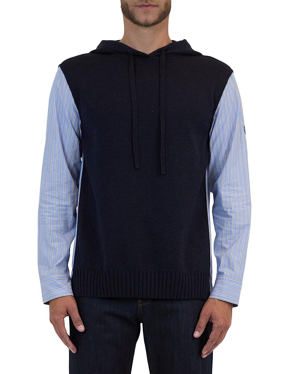 The Adonis mixed-media hoodie from SIMKHAI highlights a merino wool bodice and drawstring hood, accented by a striped cotton poplin reverse and long sleeves. Drawstring hood Long sleeves, buttoned barrel cuffs Rib-knit shirttail hem Pulls over 100% cotton Combo: 100% merino wool Dry clean Imported SIZE & FIT Model measurements: 62 tall, 40 chest, 31 waist Model is wearing a US size Medium. Mens Adv Contemporary - Mens Emerging Designer > Simkhai > Saks Fifth Avenue > Barneys. SIMKHAI. Color: Midnight Combo. Size: XL.