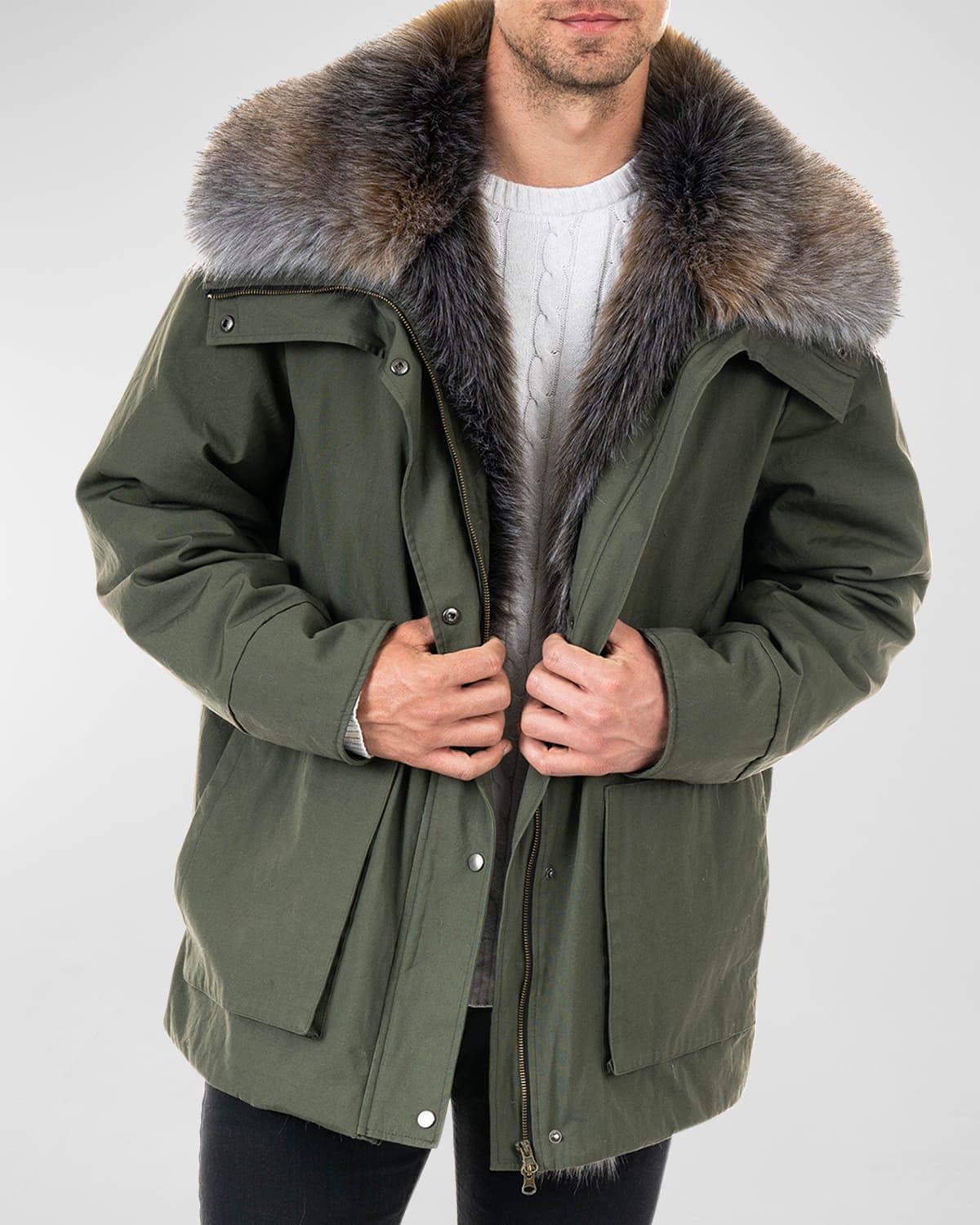 Fabulous Furs "Alpine" anorak coat with faux-fur (modacrylic/acrylic/polyester) collar and lining. Spread collar; zip/snap front closure. Side slip pockets. Straight hem. Cotton. Imported.