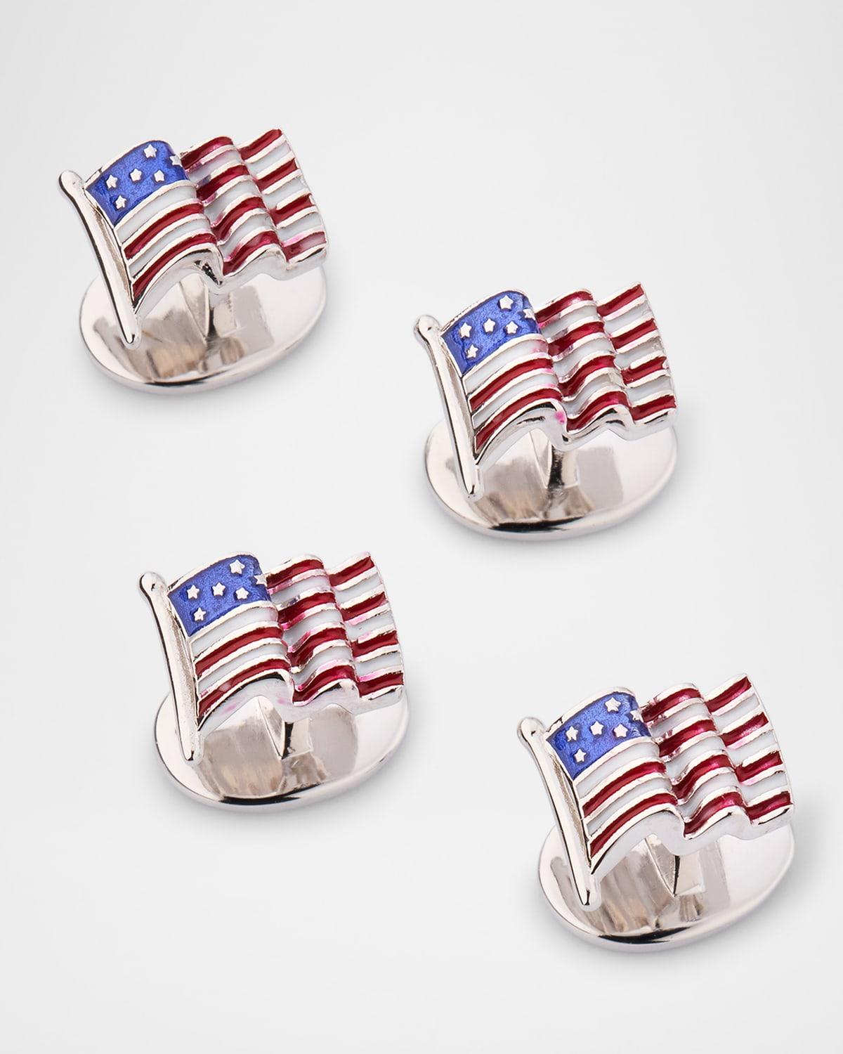 Jan Leslie set of four tuxedo studs showcasing an American flag motif 925 sterling silver Handpainted enamel Fixed backs Wipe clean Imported