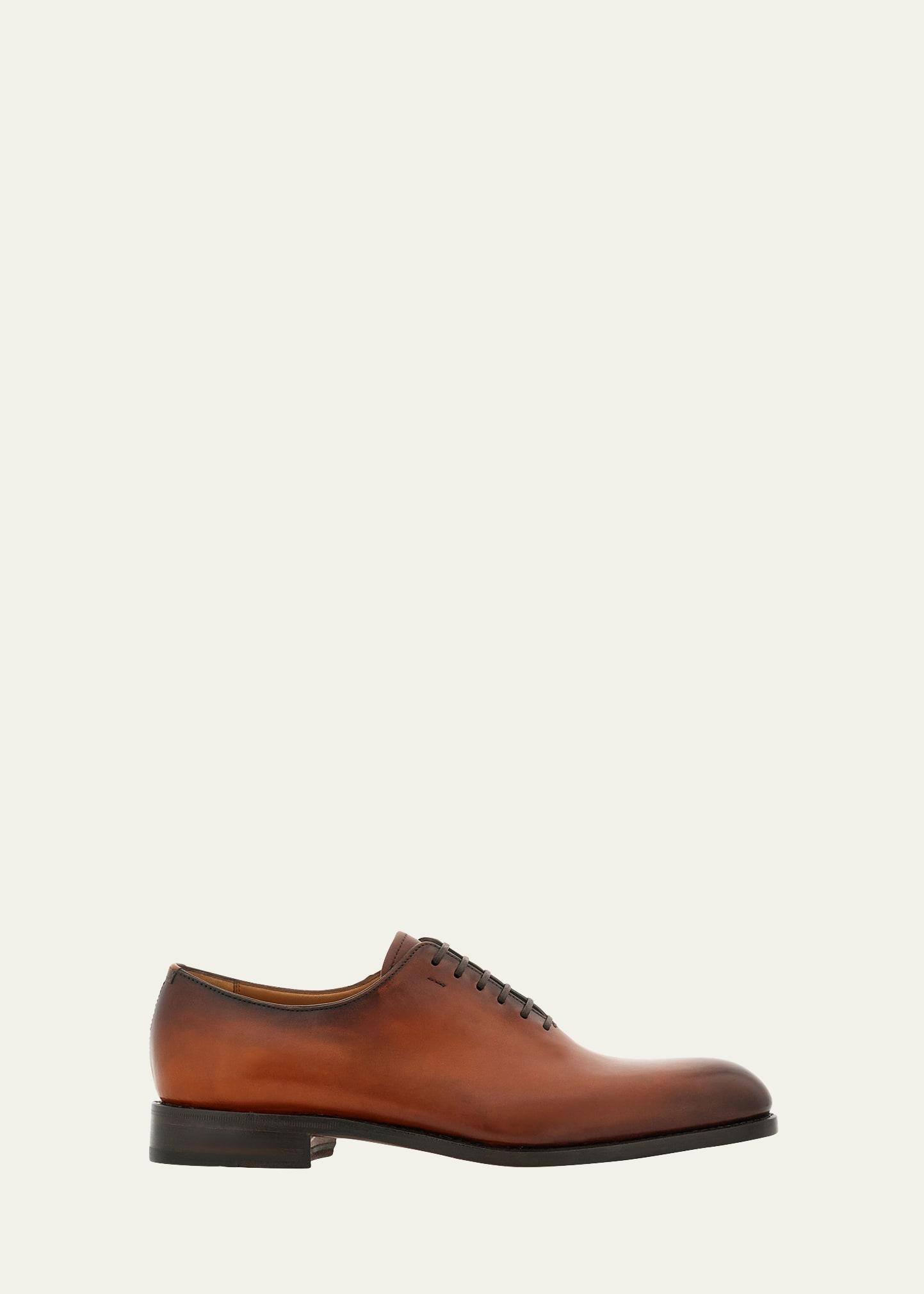 Ferragamo Angiolo oxfords in polished bitonal calfskin leather Tramezza construction to ensure a sturdy, resistant finish with a lightweight, comfortable feel Stacked heel Almond toe Lace-up vamp Leather lining Leather outsole antiqued by hand Professional cleaning recommended Made in Italy