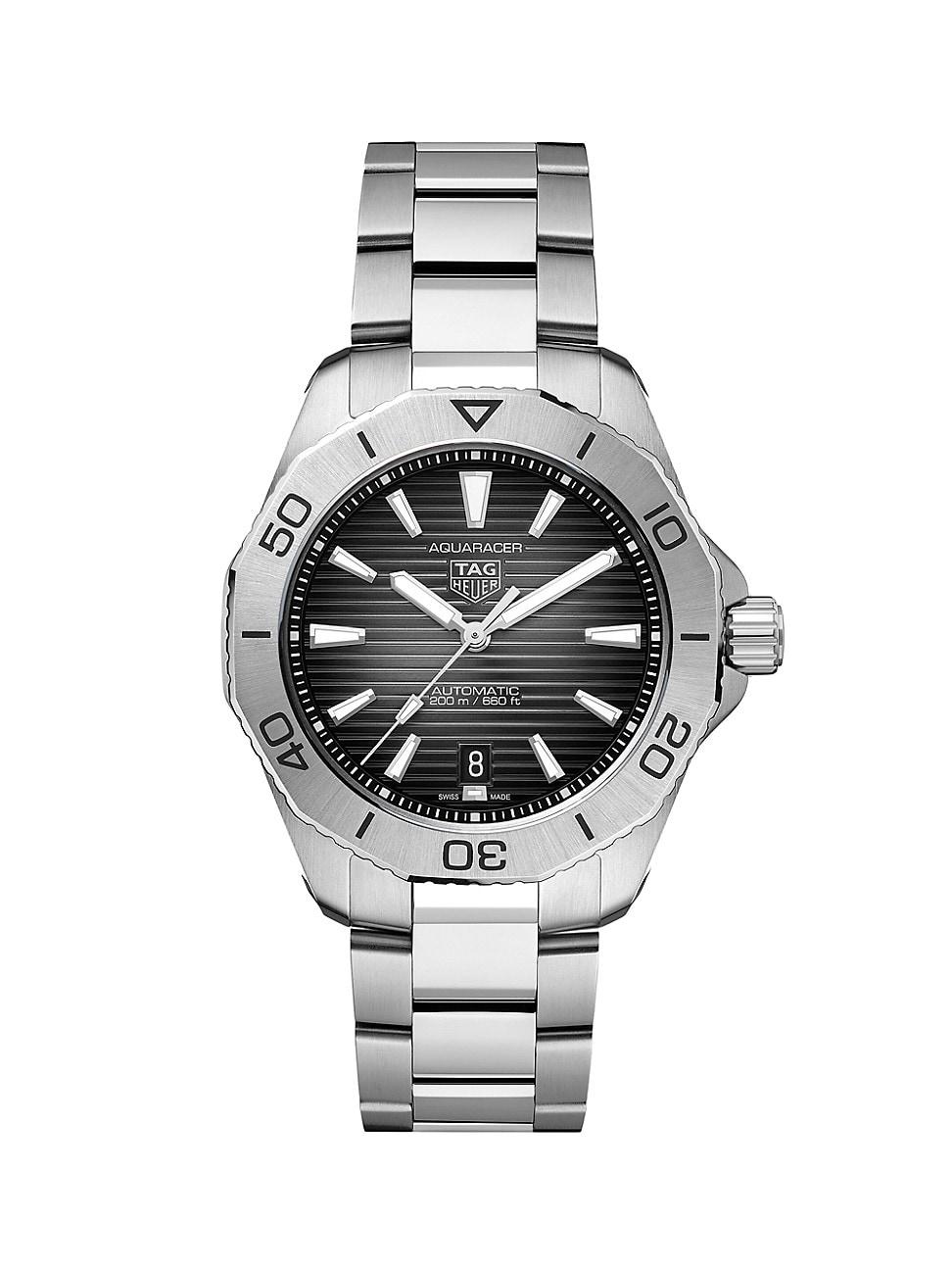 From the Aquaracer Collection. Made of stainless steel, TAG Heuers watch flaunts a rotating tachymeter bezel, a black textured dial, and a date display at six oclock. This refined timepiece is water-resistant to 20 ATM, making it the ideal accessory for swimming, high-impact water sports, and scuba diving. Automatic movement Rotating tachymeter bezel Sapphire crystal Black textured dial Super-LumiNova -filled hands and indexes Date display at 6 oclock Seconds hand Stainless steel case and bracelet Deployant buckle Made in Switzerland FEATURES Water-resistant to 20 ATM Model number: WBP2110.BA0627 SIZE Round case, 40mm (1.57) ABOUT THE BRAND In 1860, Edouard Heuer started designing timepieces in Saint-Imier, Switzerland at the age of 20. The crown-operated, keyless winding system was his first patent, which changed the course of watchmaking history. The Swiss luxury brand has gone on to introduce numerous game-changing patents and timeless designs, deeming it one of the most innovative watchmakers in the world. Fine Jewelry - Fine Watches > Tag Heuer > Saks Fifth Avenue > Barneys. TAG Heuer.