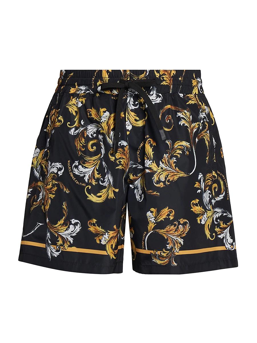 These relaxed fit shorts from Versace Jeans Couture feature a screen-printed baroque motif and accent logo detail. Elasticized drawstring waistband Side slip pockets 100% polyester Dry clean Imported SIZE & FIT Model measurements: 62 tall, 40 chest, 31 waist Model is wearing a US size 32 ABOUT THE BRAND Founded in 1978, Versace is instantly recognizable by the signature Medusa head logo, chosen by founder Gianni Versace for its Greek symbolism. The Italian label is known for its luxe, bold clothing, sneakers, shoes and accessories-think gilding, oversized logos and punchy prints. Since taking over artistic direction, Giannis sister Donatella Versace has maintained the brands strong identity, with a renewed vision to give customers the ultimate freedom to express themselves. Mens Adv Contemporary - Contemporary Collections > Versace Jeans Couture > Saks Fifth Avenue > Barneys. Versace Jeans Couture. Color: Black Gold. Size: 32.