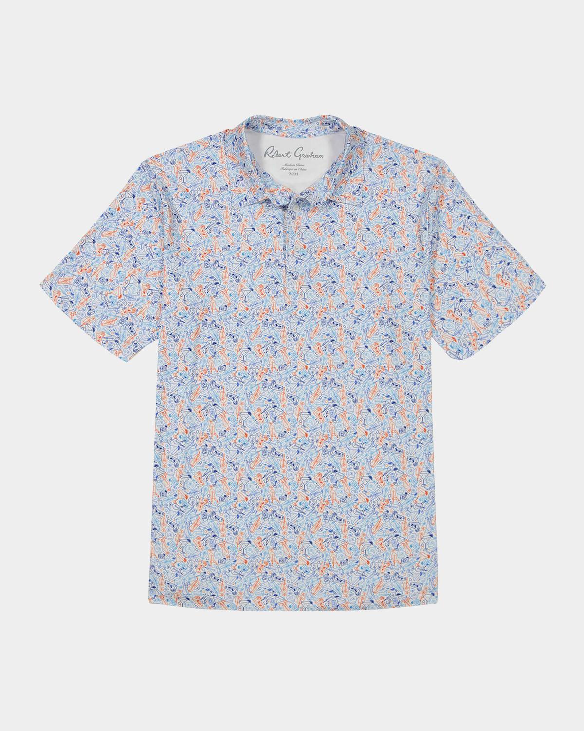 You've made a boozy bogey and now you're ready to hang. This allover drink print is just your style. Uv protection and moisture-wicking tech has you covered all the way to the 19th hole. Robert Graham "Boozy Bogey" polo shirt in moisture wicking fabric with UV protection featuring a micro drink print Contrast clubhouse logo embroidered at back neck Point collar Three-button placket Short sleeves Uneven vented sides Classic fit Pullover style Polyester/spandex Machine wash cold Imported