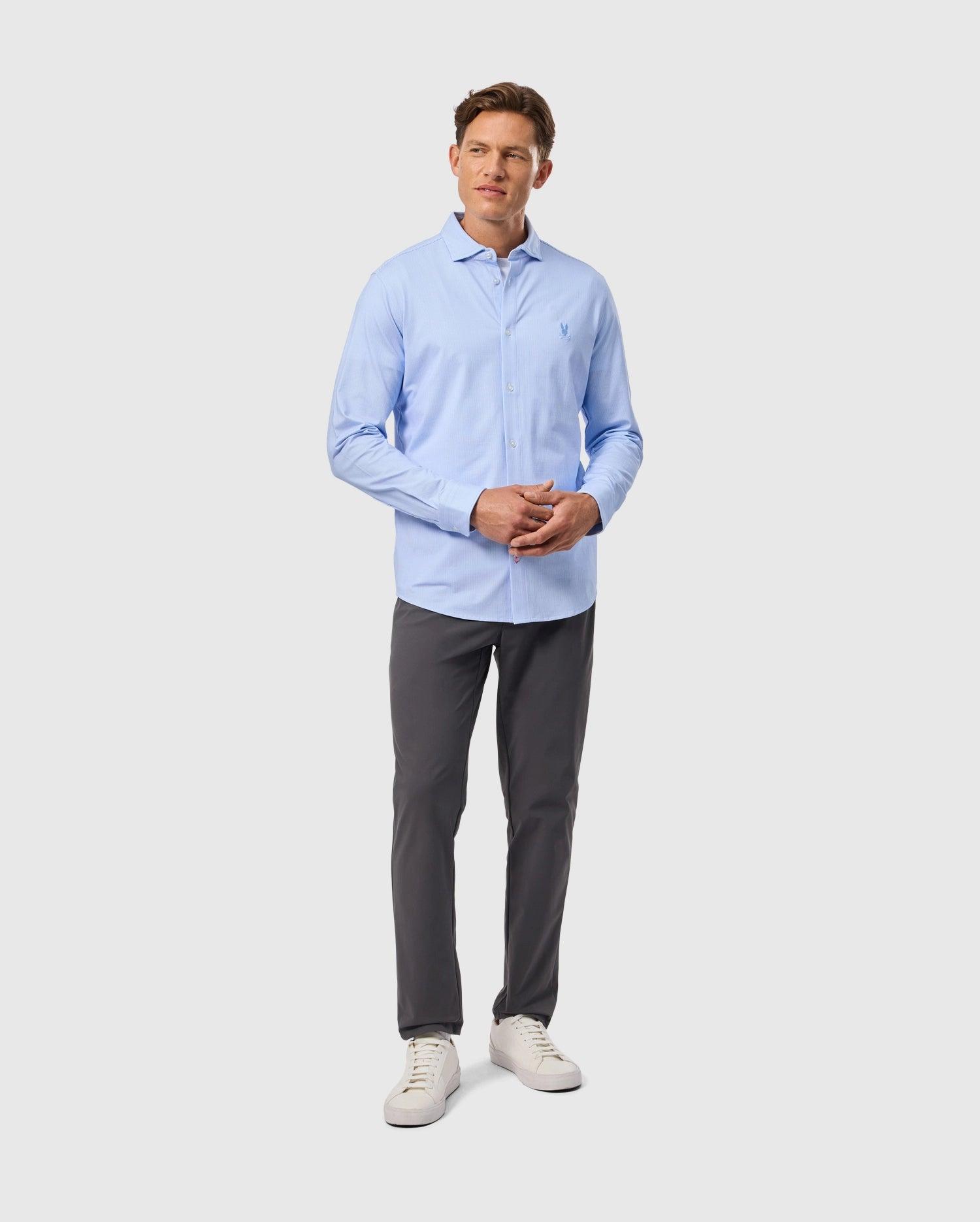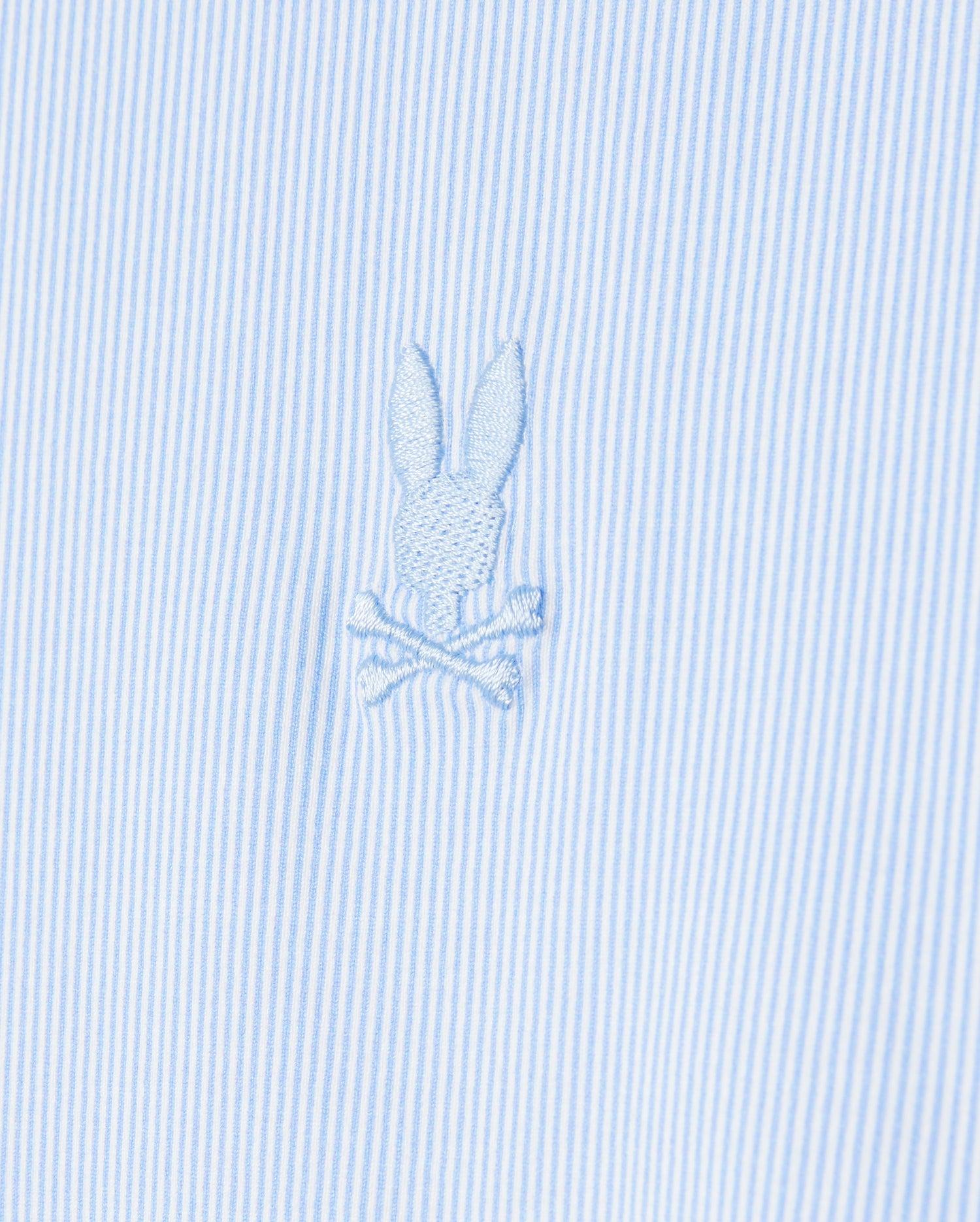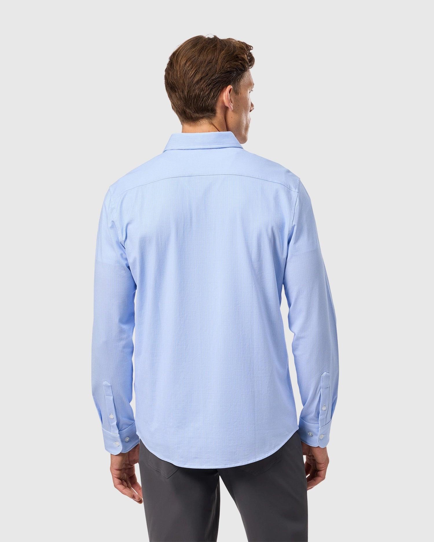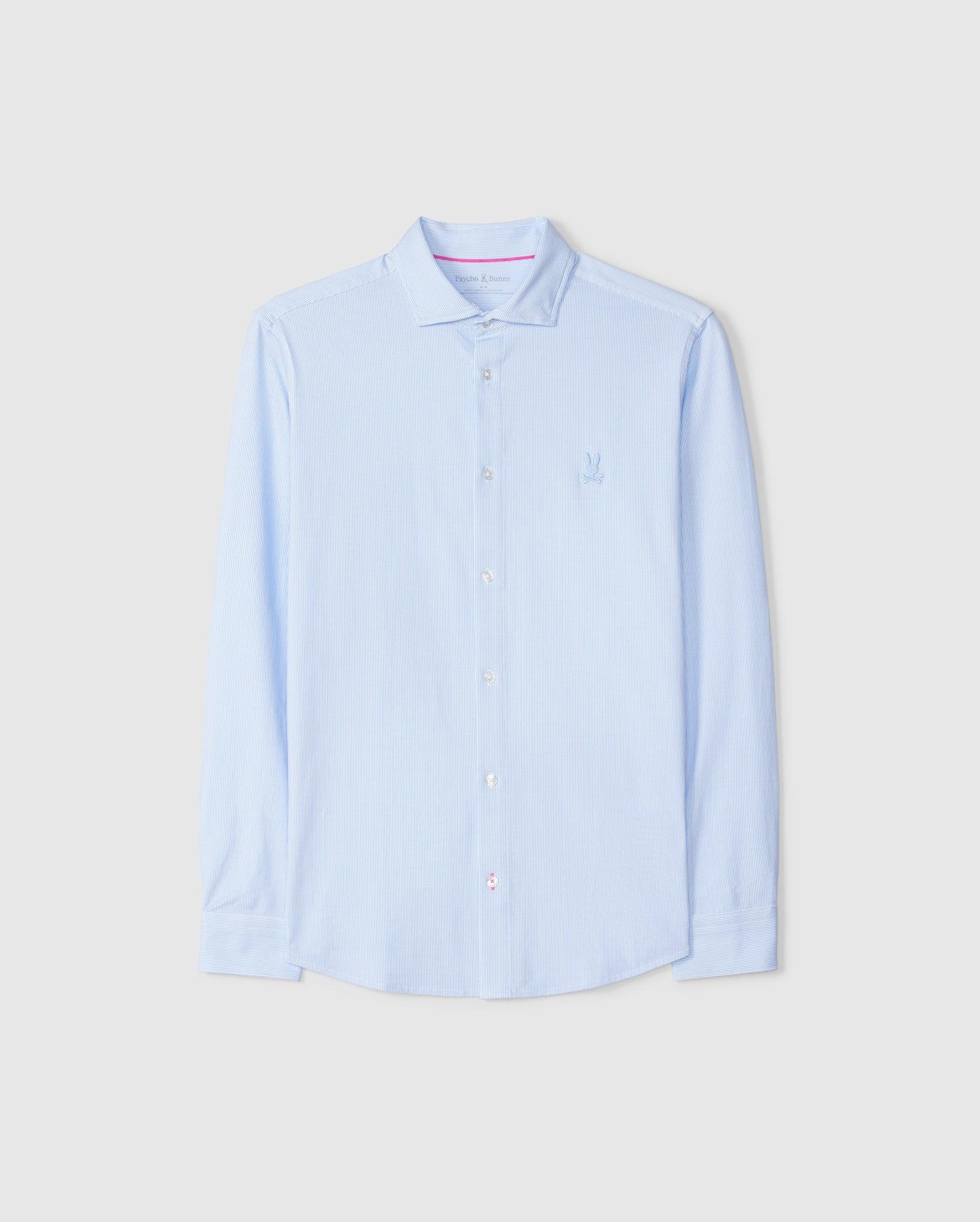 The Brook shirt is everything a man could ever hope for. Its striped design is light and subtle, while its knit stretch Pima cotton jersey is both soft and stretchy, making it the most comfortable shirt you'll ever own. Knit - 93% pima cotton, 7% spandexMade in PeruRegular fitStripeTonal embroidered chest bunny Contrast piping with matching thread and button on the last hole Hidden button down collars Labels are printed not woven Model height is 6'1 (approx. 185cm) and is wearing a size medium.