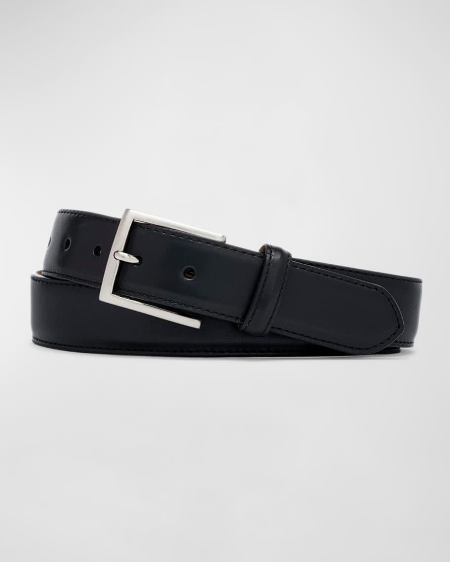 W. Kleinberg belt in semimatte calf leather Approx. 1.4W Silvertone prong buckle Leather loop Adjustable fit Leather/nickel Wipe clean Made in USA