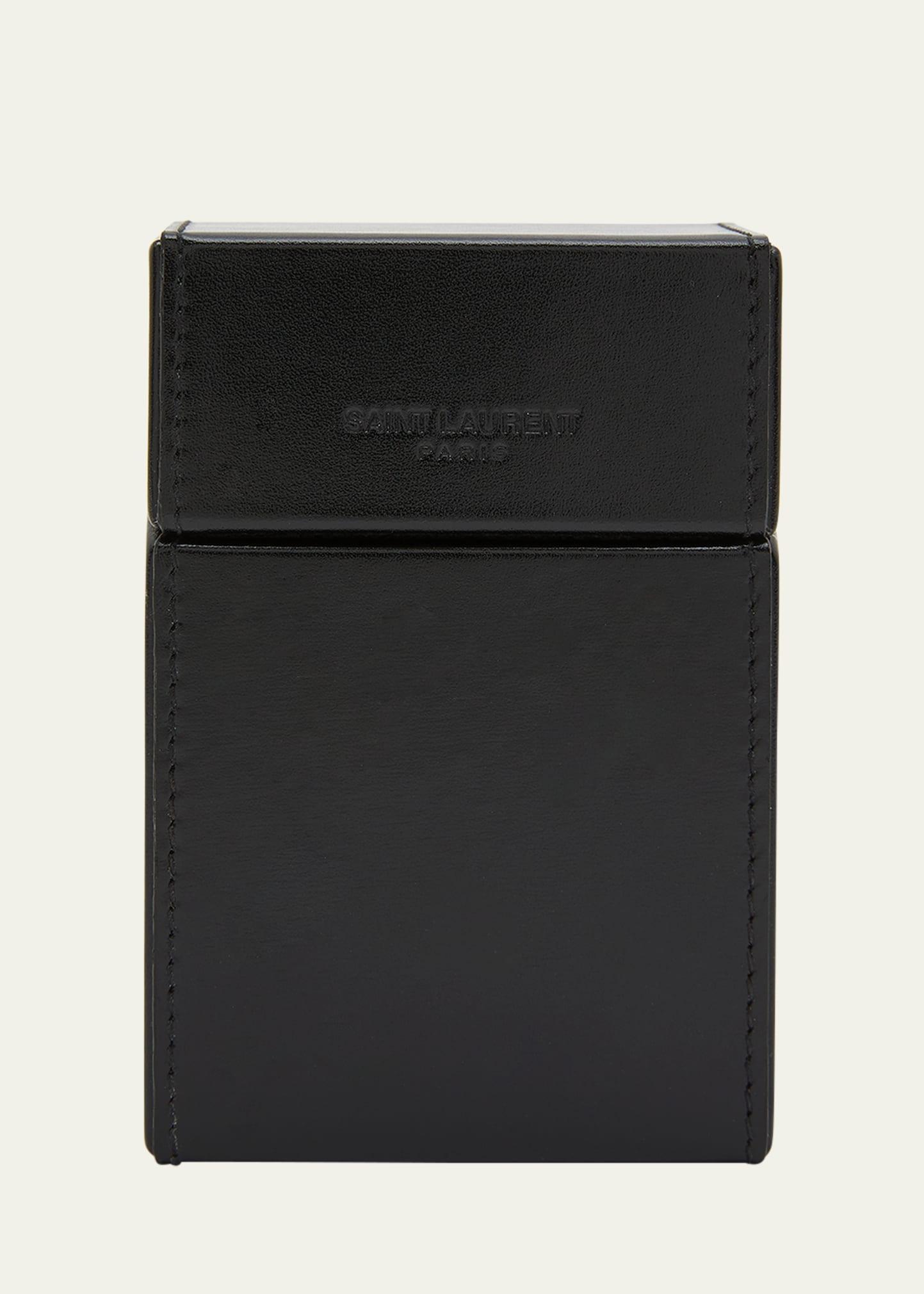 Saint Laurent cigarette holder in calfskin leather with tonal stitching Embossed logo on the front Flap top Approx. 3.9H x 2.7W Professional cleaning recommended Made in Italy