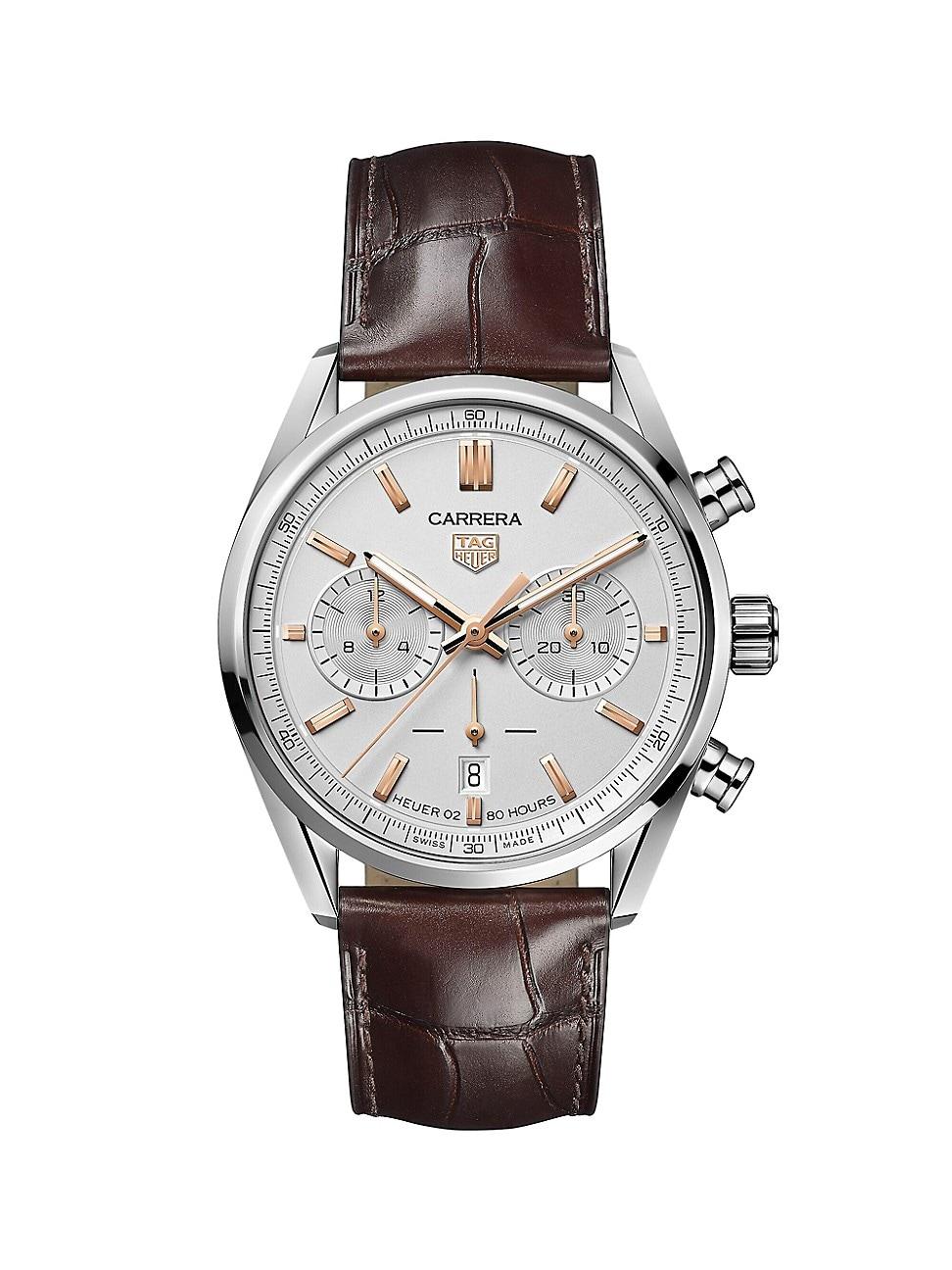 From the Carrera Collection. Jack Heuer created the Carrera watch in 1963 in tribute to the famous Carrera Panamericana auto race widely considered the most dangerous in the world. The classic yet contemporary sports watch blends fashion and function with its stainless steel design, alligator strap, vertical clutch, column wheel architecture, and Calibre 02 automatic movement visible through the clear crystal back. Calibre 02 automatic movement Polished bezel Sapphire crystal Silver-color dial with 60-second scale Luminescent bar indices Subdials: quarter second, 30 minutes counter, 12 hours counter Date window at 6 oclock Rose goldtone faceted hands with luminescent markers Second hand Stainless steel case Brown alligator strap Deployant clasp Two-year limited warranty Made in Switzerland FEATURES Water-resistant to 10 ATM 80 hours Power Reserve SIZE Round case, 42mm (1.6) ABOUT THE BRAND In 1860, Edouard Heuer started designing timepieces in Saint-Imier, Switzerland at the age of 20. The crown-operated, keyless winding system was his first patent, which changed the course of watchmaking history. The Swiss luxury brand has gone on to introduce numerous game-changing patents and timeless designs, deeming it one of the most innovative watchmakers in the world. Fine Jewelry - Fine Watches > Tag Heuer > Saks Fifth Avenue > Barneys. TAG Heuer. Color: Stainless Steel.