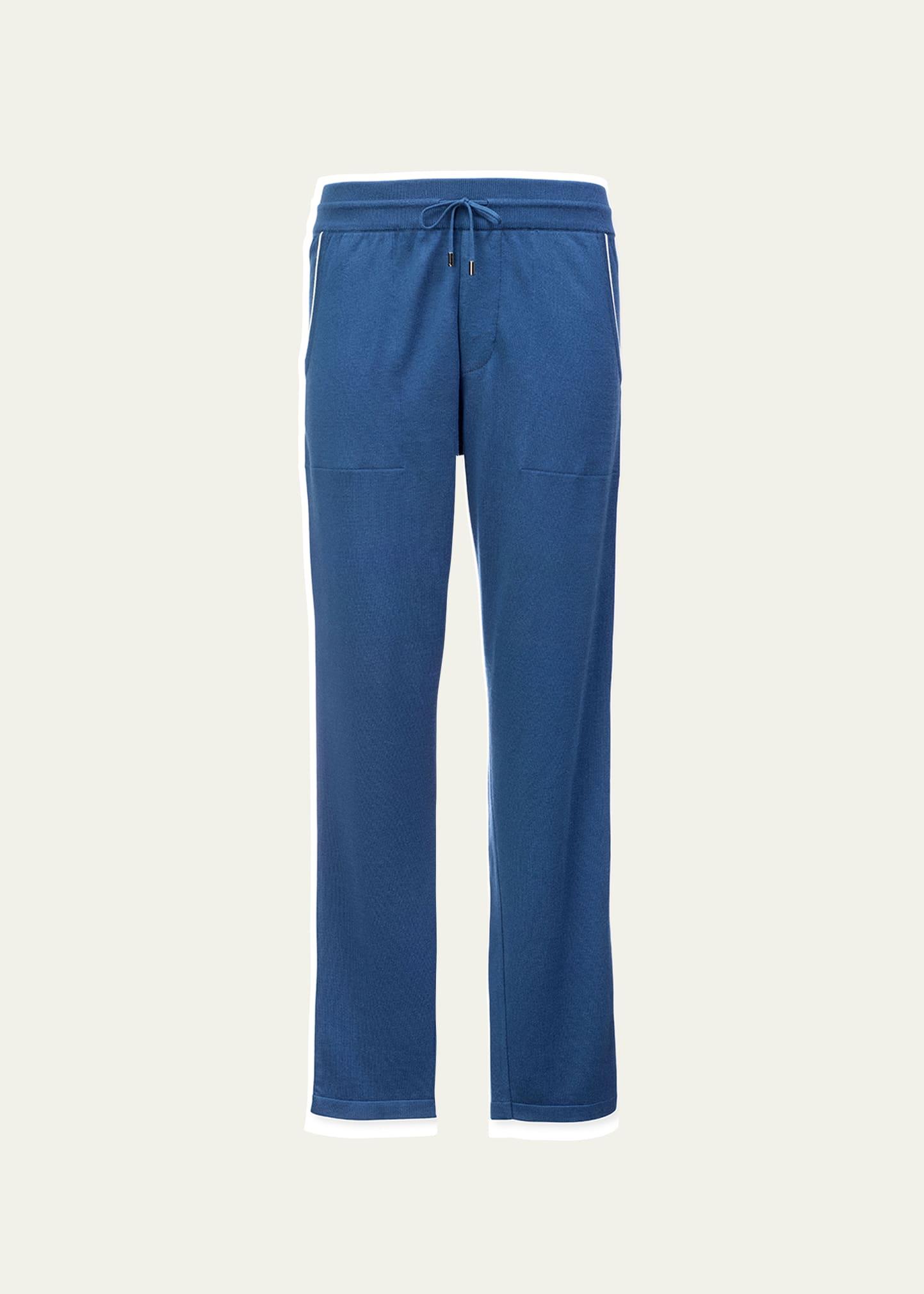 Loro Piana solid sweatpants with contrast piping. Elasticized drawstring waist. Side slip pockets. Casual legs. Pull-on style. Cashmere. Made in Italy.