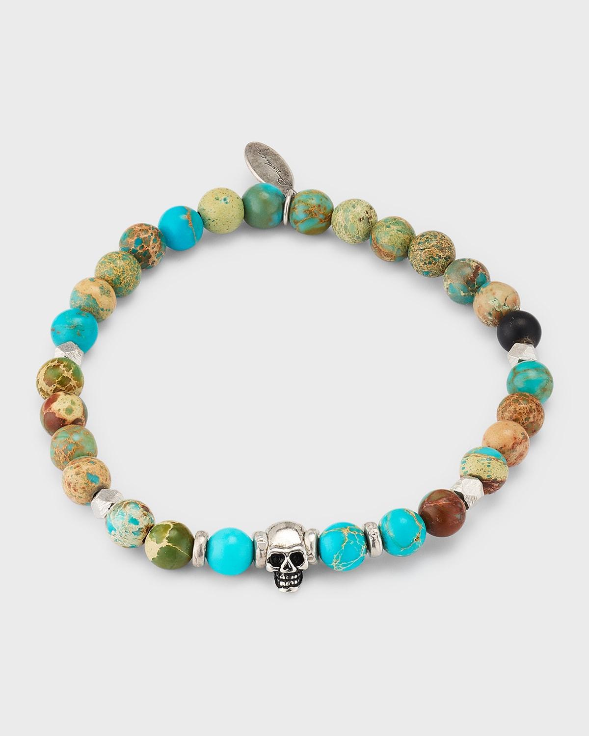 This Jan Leslie stretch bracelet features chrysocolla beads accented with matte black agate. Accented with a graphic skull, this bold accessory offers sterling silver details. Chrysocolla beads Black agate Sterling silver Slips on Imported SIZE Beads, about 6mm Adjustable: about 7L. Men Accessories - Jewelry > Jan Leslie > Saks Fifth Avenue > Barneys. Jan Leslie. Color: Aqua.