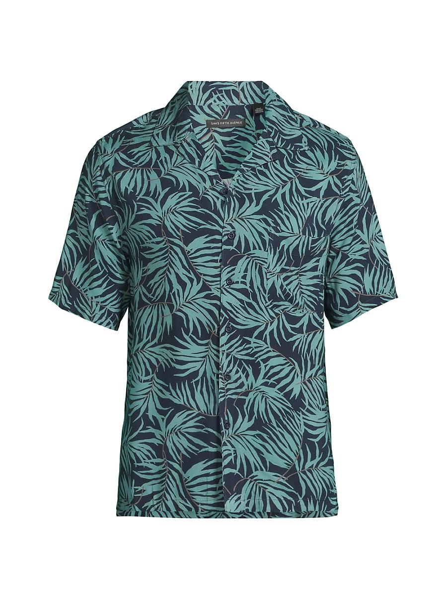 This Saks Fifth Avenue shirt is adorned with a tropical leaf silhouette print. A camp collar, chest patch pocket, and front button closure lend added structure to this design. Camp collar Short sleeves Chest patch pocket Front button closure 100% viscose Machine wash Imported SIZE & FIT About 27 from shoulder to hem Model measurements: 62 tall, 40 chest, 31 waist Model is wearing a US size Medium. Mens Pvt Brands - Sfamc Sportswear > Saks Fifth Avenue > Saks Fifth Avenue > Barneys. Saks Fifth Avenue. Color: Deep Navy Green. Size: XXXL.