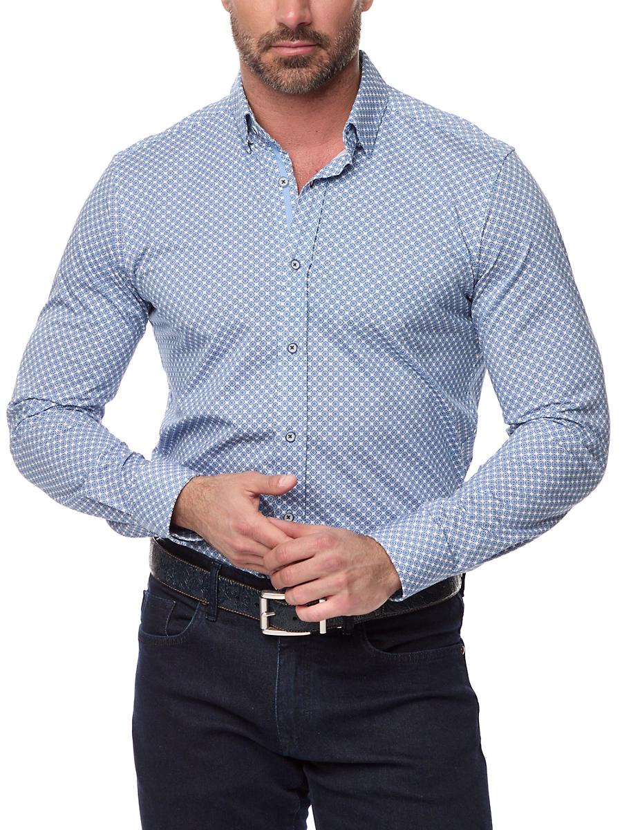 Robert Graham Conall sport shirt featuring a micromedallion print Approx. 34.5L from shoulder to hem Grosgrain trim on the inner placket and cuffs Point collar Button placket Long sleeves; approx. 40.0L Mitered barrel cuffs Back yoke Curved hem Classic fit Cotton/spandex Machine wash cold Made in Morocco