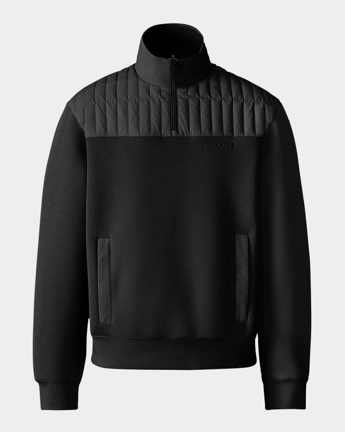 Mackage "Corey" hybrid sweater crafted from double-face jersey Vertical-quilted front and back yokes Stand collar Quarter-zip closure Silicone logo on chest Welt pocket at waist with zipper opening Rib knit cuffs and hem Down/feather fill Cotton/polyester/nylon/polyamide Machine wash Imported