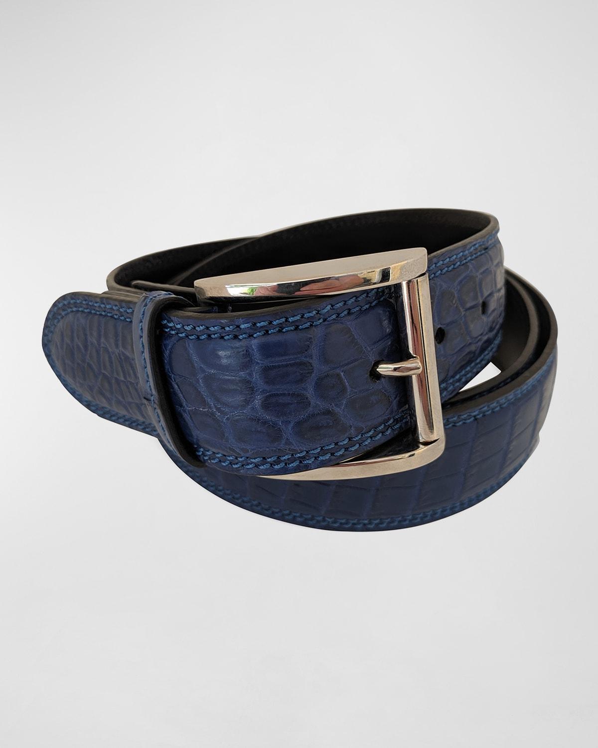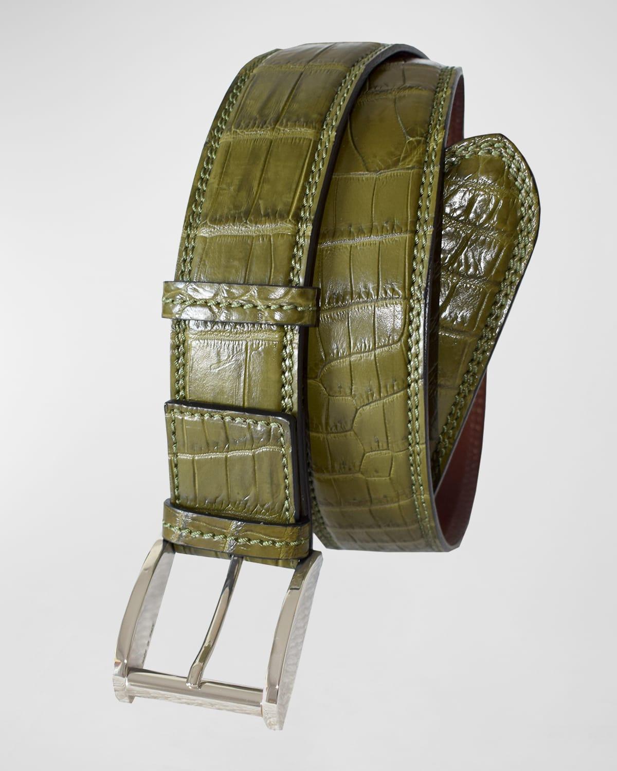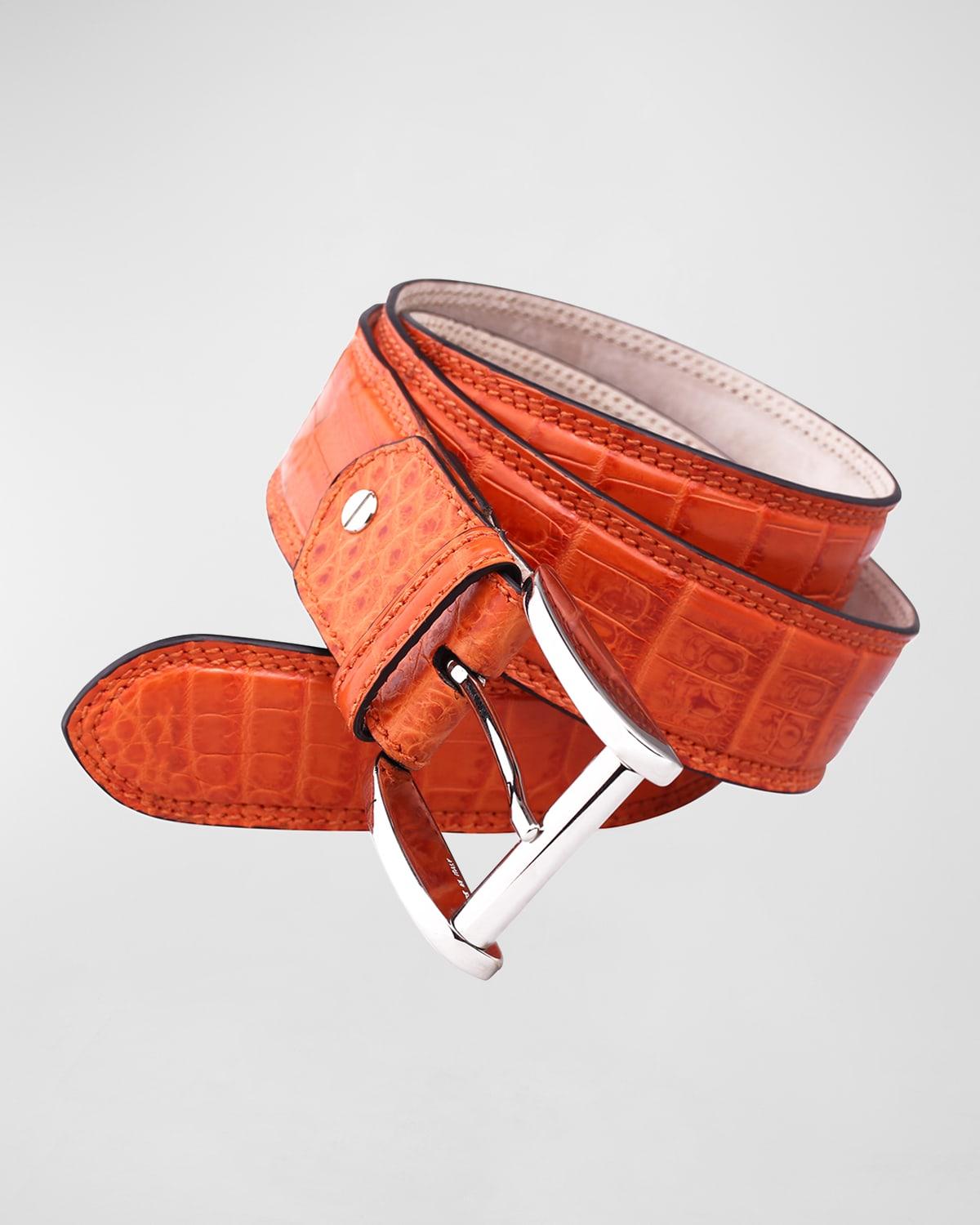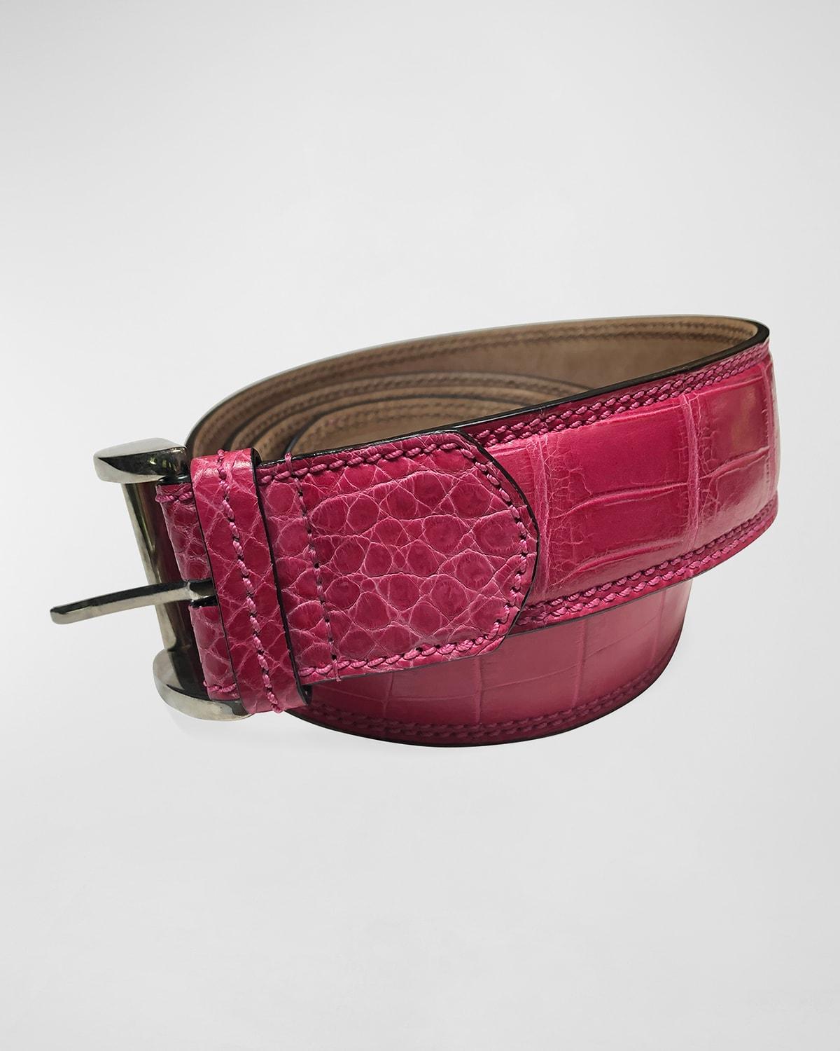 Zambezi Grace belt is handmade of crocodile (Zimbabwe) hide, leather, and silk. Silvertone square buckle. Adjustable fit. Made in South Africa.