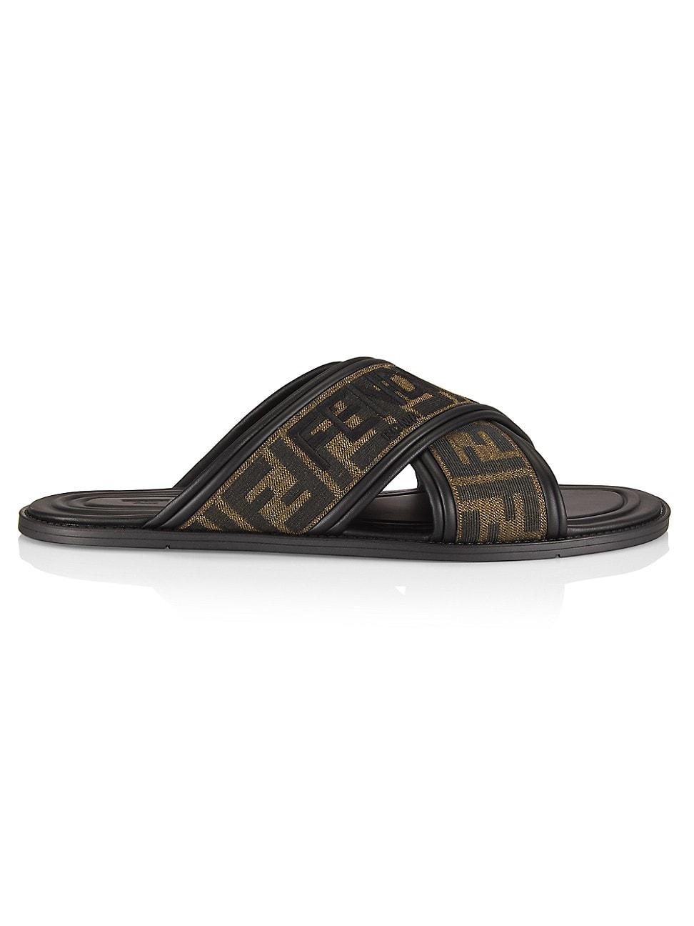 These sandals feature a cross-strap design decorated with Fendis FF monogram and a contrasting logo, a soft leather lining, and a rubber sole. 65% polyamide/35% cotton Open toe Slip on Lining: polyester/lamb leather Rubber sole Made in Italy ABOUT THE BRAND The epitome of fine Italian craftsmanship, Fendi was founded in Rome in 1925 by Adele and Edoardo Fendi. Today, the founders granddaughter and Creative Director, Silvia Venturini Fendi, continues the houses emphasis on tradition, experimentation, and creativity. Mens Shoes - Designer Shoes > Fendi > Saks Fifth Avenue > Barneys. Fendi. Color: Tabacco Nero. Size: 12.