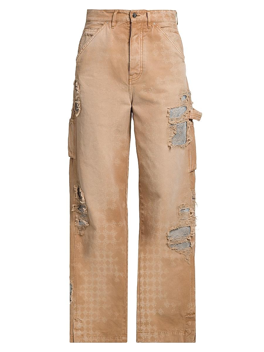 Crafted of cotton, these denim workwear pants from Amirifeature a faded-effect signature monogram bandana print, side cargo pockets, and distressed accents. Belt loops Five-pocket style Zip fly 100% cotton Dry clean Made in Italy SIZE & FIT Model measurements: 62 tall, 32 waist Model is wearing a US size Medium ABOUT THE BRAND Designer and California native Mike Amiri got his start making handcrafted pieces for rockstars to wear on stage. He brings the same L.A. rocker aesthetic to his eponym