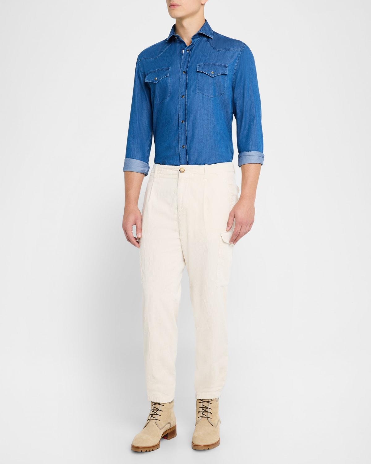 Brunello Cucinelli western shirt in cotton denim Spread collar Button placket Chest flap pockets Long sleeves Mitered barrel cuffs Western back yoke Curved hem Cotton Unlined Dry clean, hand wash, machine wash cold, line dry Made in Italy Model is 6'1"/185cm.