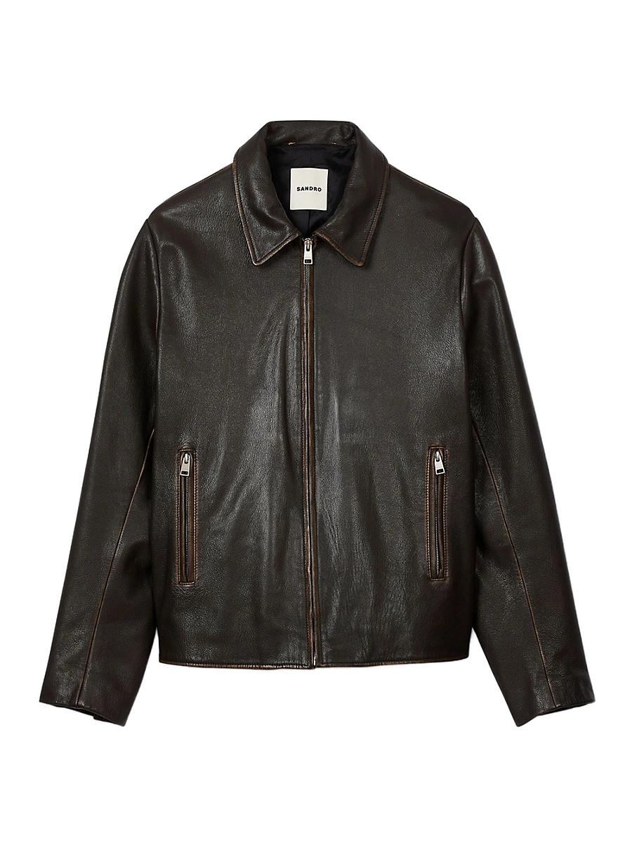Worn-effect leather jacket with a casual style, zip fastening, shirt collar and zip pockets. Sandro Mens worn-effect leather jacket Shirt collar Long sleeves with slit cuffs Zip fastening 2 zipped pockets Made with more responsibly tanned leather Main material: 100% goatskin leather Lining: 100% viscose Pocket lining: 100% cotton Imported. Lsd Rtw - Sandro > Sandro > Saks Fifth Avenue > Barneys. Sandro. Color: Moka. Size: XL.