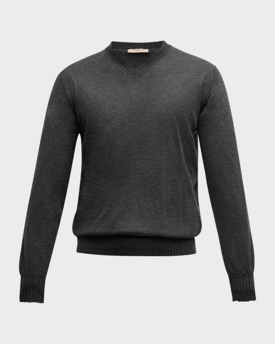 Fioroni "Duvet" knit pullover sweater in ultra-soft cashmere Ribbed V-Neck Long sleeves Ribbed cuffs and hem Pullover style Cashmere Unlined Dry clean Made in Italy Model is 6'1"/185cm.