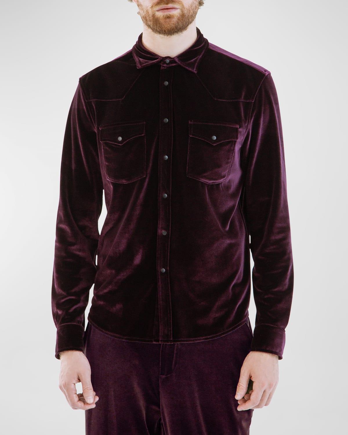 monfrere Eastwood shirt in solid velvet Western-style yokes and flap pockets Point collar Snap front closure Long sleeves Classic fit Polyester/viscose/elastane Dry clean Made in USA from imported materials