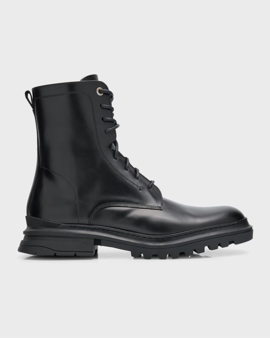 Aquatalia Edmundo combat boots in smooth leather Chunky heel Round toe Lace-up vamp Pull tab at backstay Side zip for easy on and off Weatherproof Lining: Leather Spot clean Made in Italy