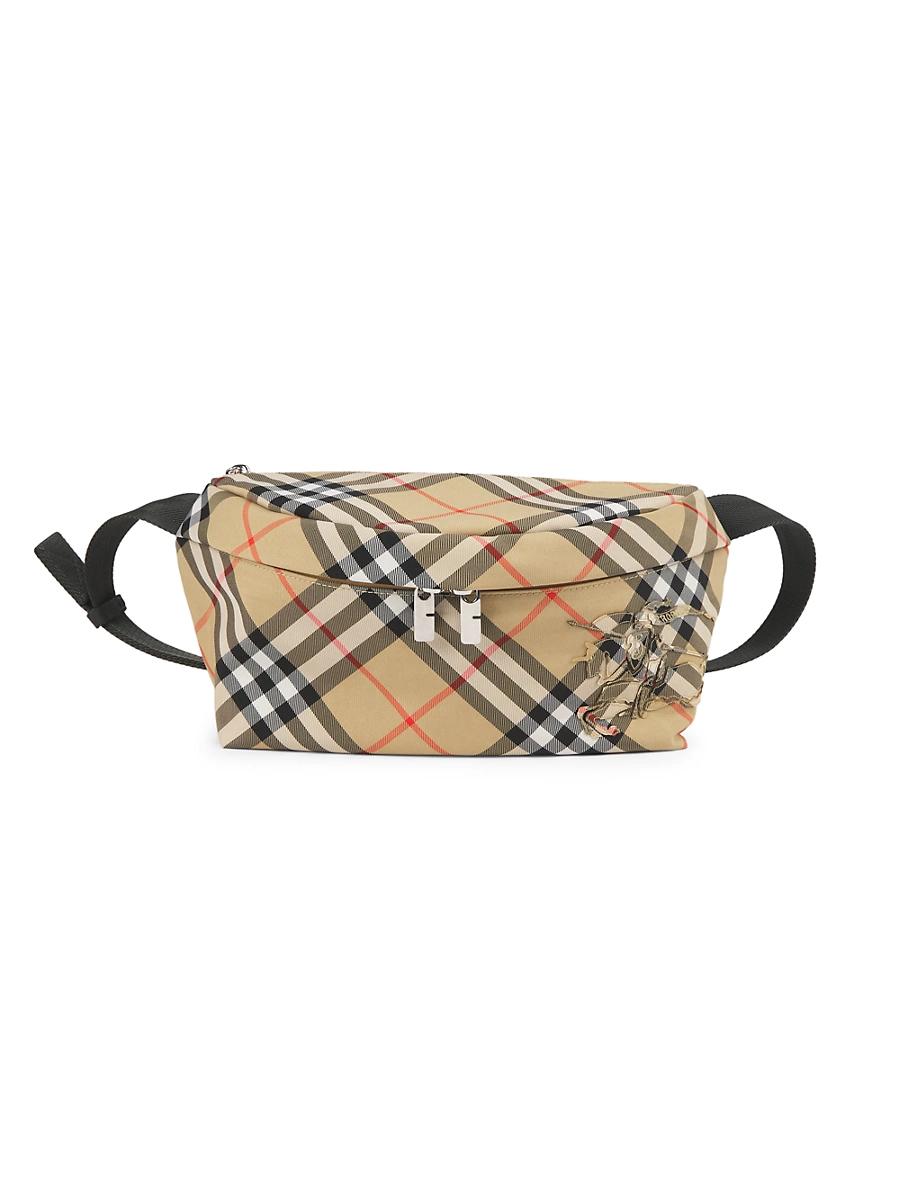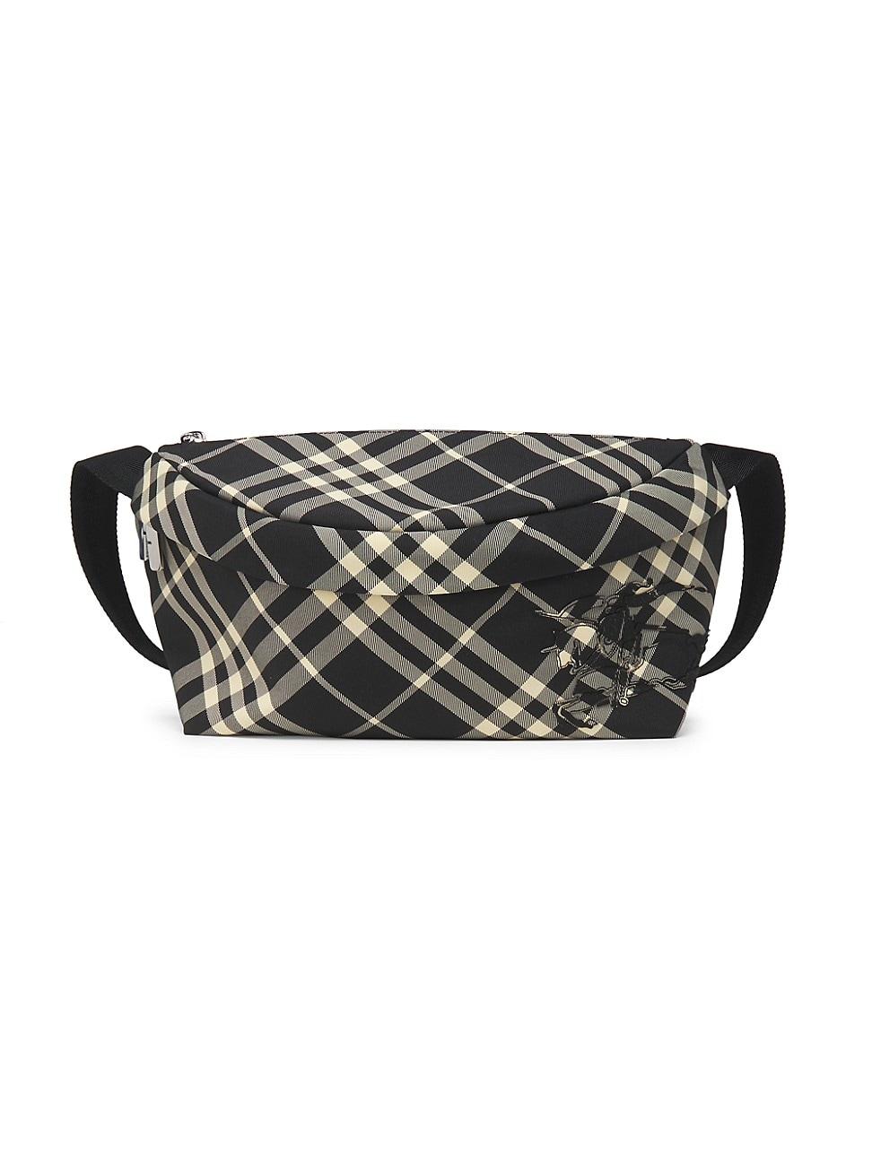 The Essential belt bag is adorned with Burberrys signature check pattern. It features an adjustable crossbody strap and a two-way zip closure. Adjustable strap Open compartment Two-way zip closure 92% polyester/ 8% polyurethane Lining: 92% polyester/ 8% polyurethane Spot clean Imported SIZE About 13W x 4.3D x 7.1H Strap length: 29.5-45.3 ABOUT THE BRAND Founded in 1856 by 21-year-old Thomas Burberry, the brand set out with a mission to stylishly protect against British weather-and Burberrys iconic trench coat was born. In the 1920s, its renowned check pattern was introduced as the coats lining. Today, under Creative Director Daniel Lee, the heritage brand continues to evolve and create timelessly classic mens, womens and kids pieces, along with beauty. Men Accessories - Designer Accessories > Burberry > Saks Fifth Avenue > Barneys. Burberry. Color: Black Calico.