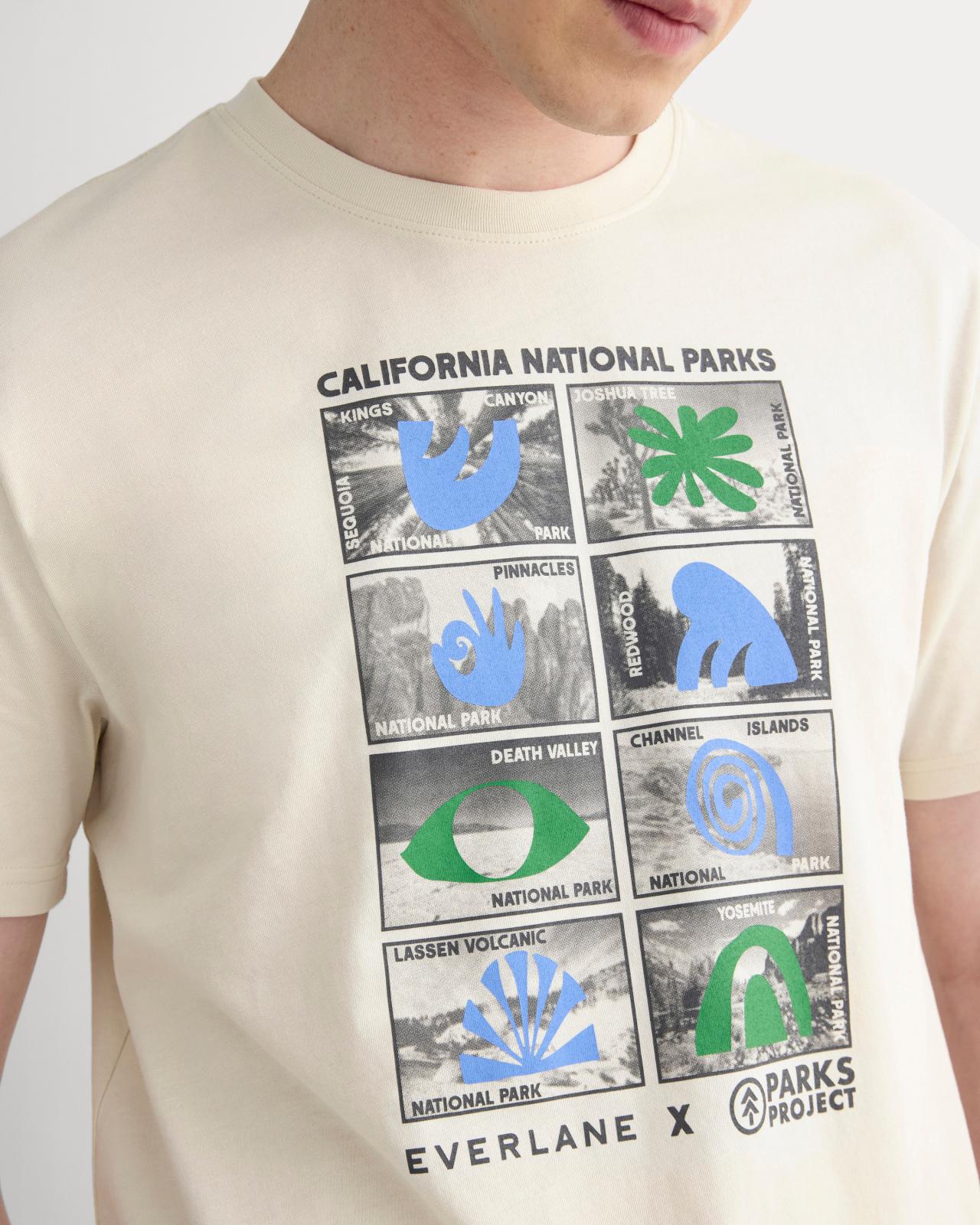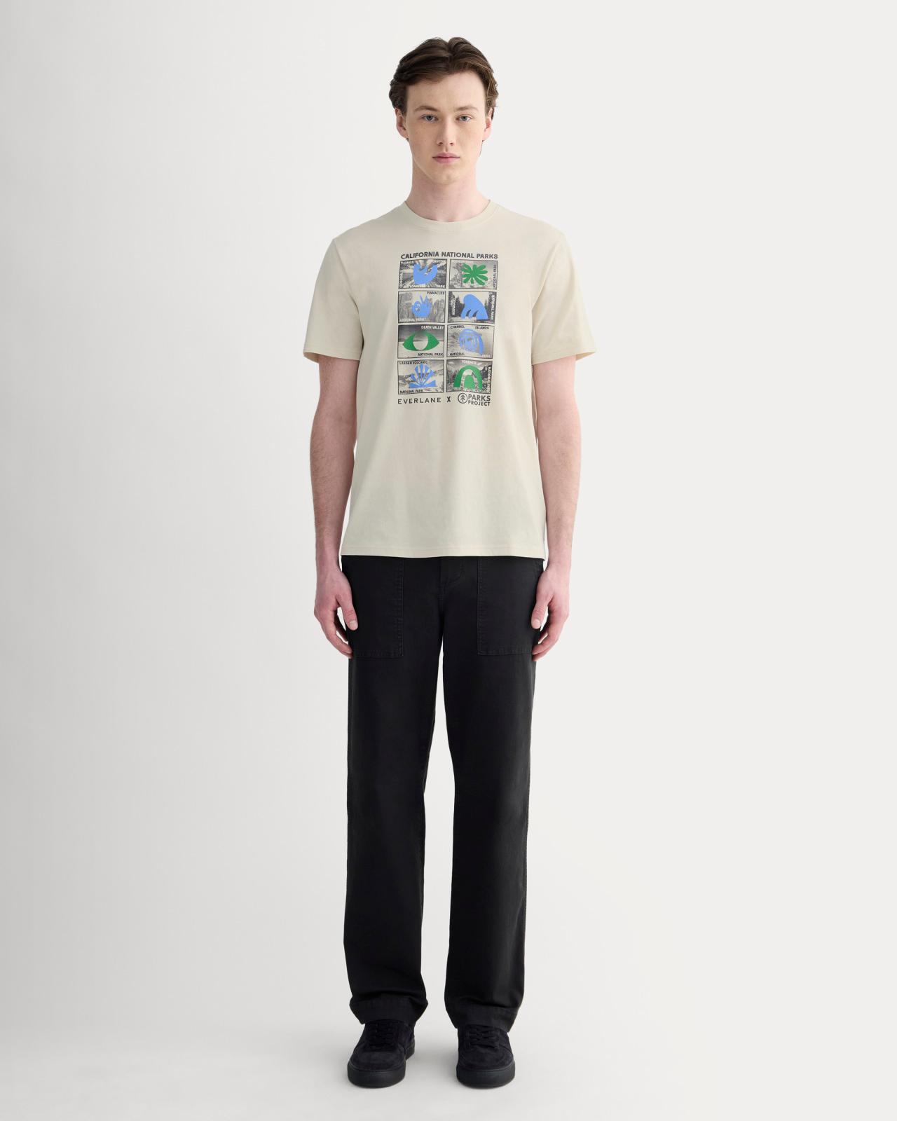 About This Style. We took our best-selling Essential Organic Crew and teamed up with Parks Project to honor the great outdoors. Made from 100% certified organic cotton its soft breathable and designed to lastjust like the landscapes Parks Project helps protect. Finished with custom screen-printed graphics this limited-edition tee celebrates our ongoing work to champion environmental sustainability and support the preservation of our National Parks. Wear it out there. As part of our collaboration with the Parks Project were collectively donating $10 000 to the National Parks Conservation Association to help protect and preserve our National Parks. Mens Everlane x Parks Project Essential Organic Crew Neck T-Shirt by Everlane in Forged Iron/Birch/Granada Sky Blue/Green, Size XXL
