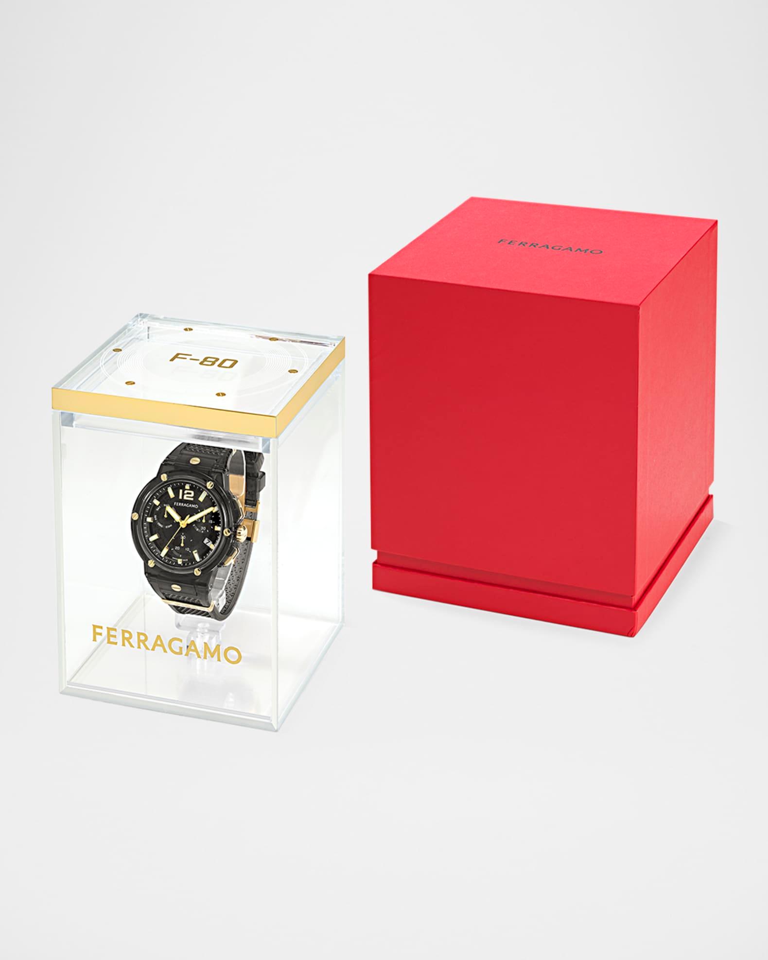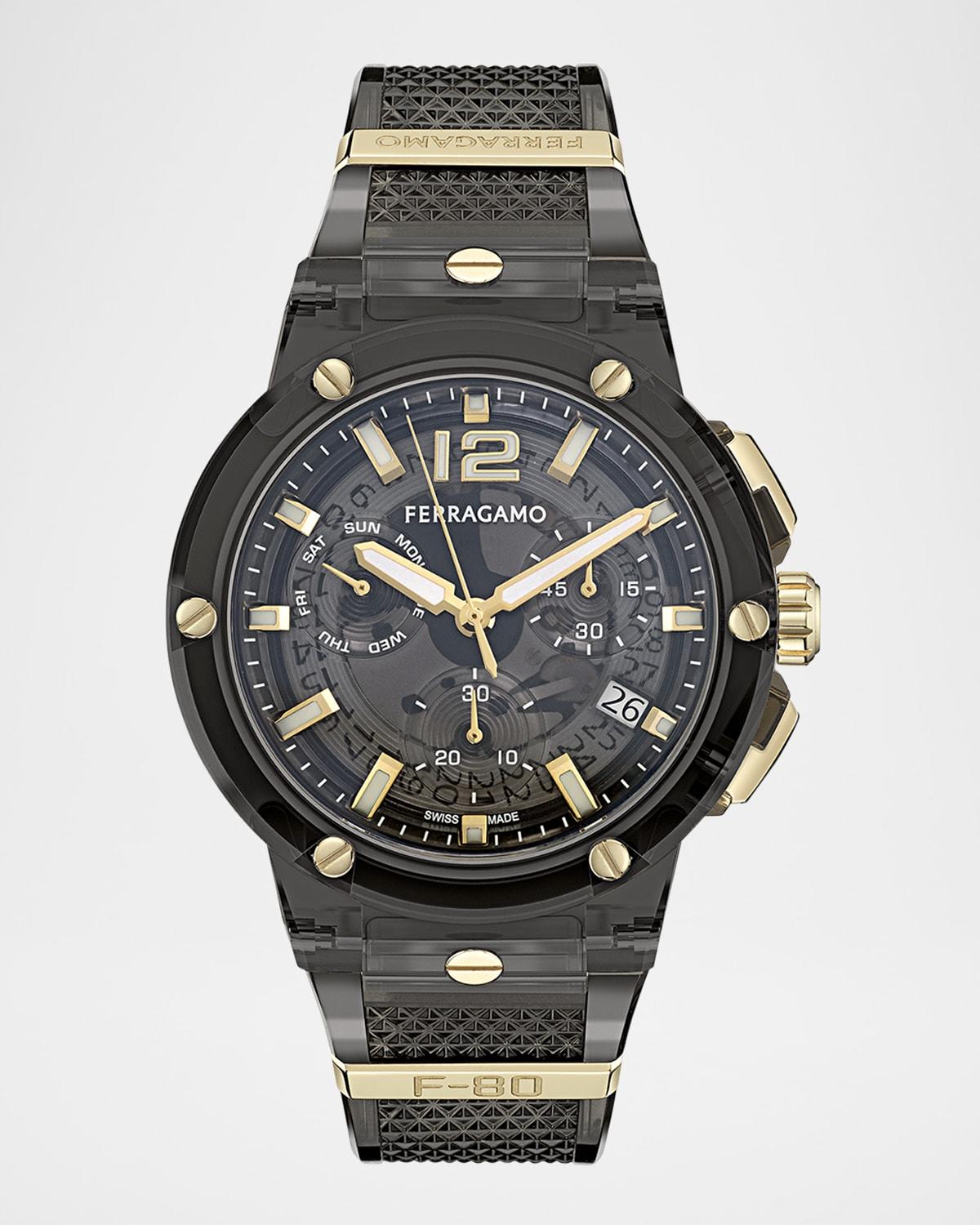 Ferragamo "F-80" men's watch 44mm; black bioplastic case Sapphire crystal glass Black transparent dial; three subdials Logo at 12 o'clock Date window at 4 o'clock Recycled polyutherane strap Water resistant at 5 ATM Swiss quartz movement Spot clean Made in Switzerland