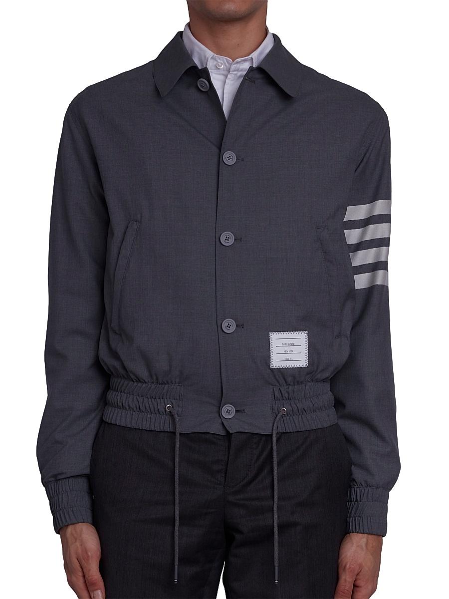 Designed with signature four-bar striping on the sleeve, Thom Brownes jacket is crafted from lightweight nylon to a sporty button-up silhouette. Spread collar Long sleeves with elasticized cuffs Button front Waist welt pockets Elasticized drawstring hem Polyamide/polyurethane Dry clean Made in Italy SIZE & FIT About 27 from shoulder to hem Model measurements: 62 tall Model measurements: neck 15, chest 40, waist 35 Model is wearing US size Medium. Men Advcd Dsgnr - Advanced Designer Collec > Thom Browne > Saks Fifth Avenue > Barneys. Thom Browne. Color: Navy. Size: Large.