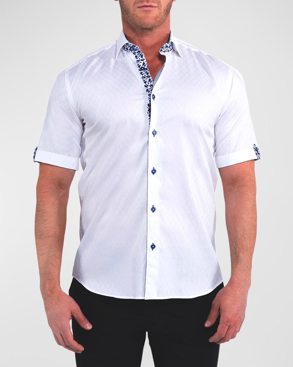 Maceoo Galileo sport shirt in tonal diamond jacquard with contrasting trim Shaped fit accentuates the body while leaving room for comfortable movement Spread collar; button placket Rolltab sleeves Yoked back shoulders Curved hemline Cotton Machine wash cold, line dry Imported
