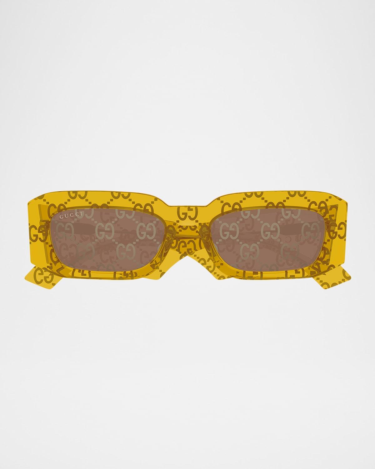 Gucci "GG1426SM" rectangle sunglasses in acetate feature an allover GG logo pattern Lens/bridge/temple (in mm): 54-19-145 Right lens logo script Saddle nose bridge Thick, tapered arms Exposed metal corewire Curved temple tips Acetate 100% UVA/UVB protection Made in Italy Proposition 65 warning for California residents