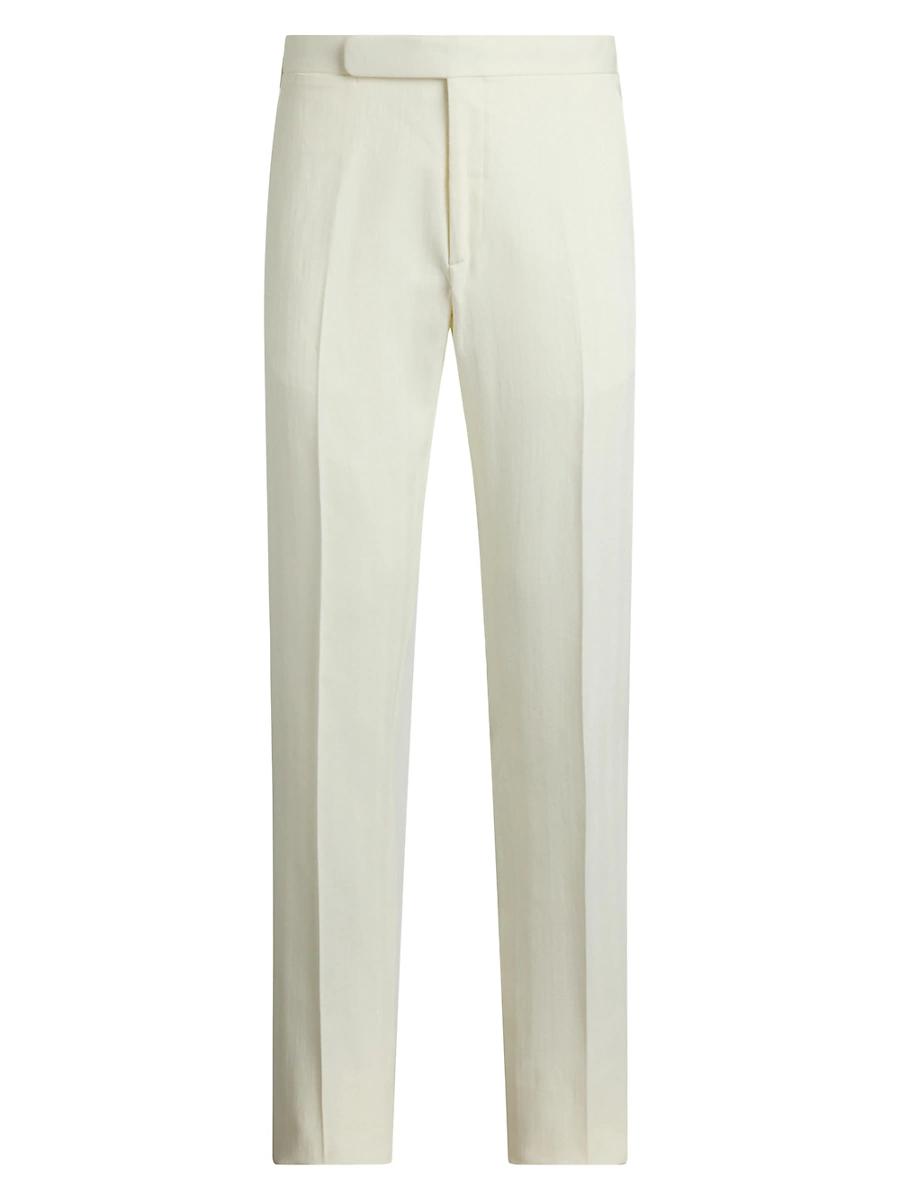 The Gregory flat-front trousers from Ralph Lauren Purple Label are hand-tailored in Italy using a custom-developed herringbone cloth that combines soft cotton and lightweight linen. Extended tab waistband, side waistband adjusters Side slant pockets Back button-through welt pockets Rolled cuffs Zip fly, hook-and-bar closure Cotton/ linen Lining: Viscose Dry clean Made in Italy SIZE & FIT Straight fit Rise: about 9.25 Leg opening: about 15.5 Model measurements: 62 tall, 40 chest, 31 waist Model is wearing a US size 32. Men Luxury Coll - Rl Purple Label > Ralph Lauren Purple Label > Saks Fifth Avenue > Barneys. Ralph Lauren Purple Label. Color: Lux Cream. Size: 38.