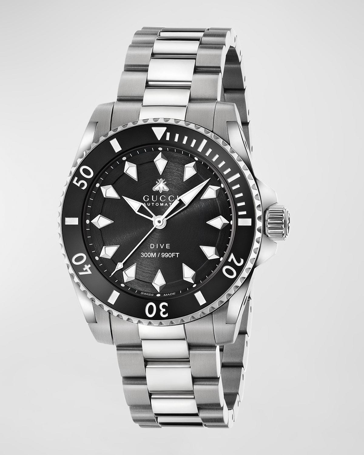 From the Gucci Dive Collection. The recognizable Gucci Dive watch continues to explore emblematic house codes in new ways. A historic Gucci symbol, the bee appears as a subtle detail atop the accessory. Designed with a black dial, the watch is completed by a steel bracelet. Automatic movement Black ceramic bezel Sapphire glass with anti-reflective coating Screw-down crown Black dial Diamond-shaped hour markers Second hand Steel case and bracelet Deployant buckle Made in Switzerland FEATURES Water-resistant to 30 ATM Power reserve 38 hours SIZE Round case, about 40mm (1.57) ABOUT THE BRAND First launched in 1921, the Italian luxury fashion house quickly became known for its fine leather craftsmanship and accessories. Today, the visionary brand continues to redefine fashion trends, while celebrating creativity and innovation. Guccis contemporary designs include shoes, clothing and accessories-often boasting the distinctive Horsebit motif. Men Accessories - Watches And Gifts > Gucci > Saks Fifth Avenue > Barneys. Gucci. Color: Black Steel.