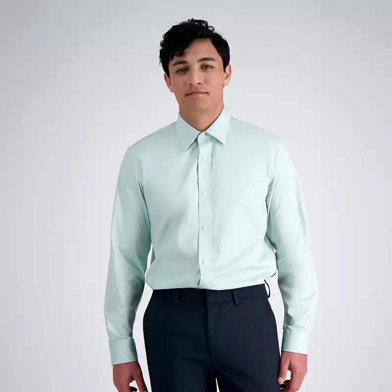 Youll look perfectly polished sporting this mens Haggar slim-fit dress shirt. Stretch fabric technology Wrinkle resistant fabric Spread collar flares to accommodate wider tie knots Cuffed sleeves Button front Long sleevesFIT & SIZING Slim fitFABRIC & CARE Cotton, spandex Machine wash Imported Size: 14.5-32/33. Color: Green. Gender: male. Age Group: adult.