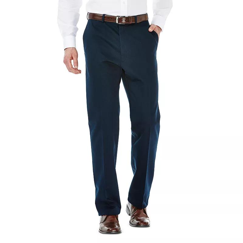 Always handsome, always Haggar. You cant go wrong with these mens flat-front no-iron pants. Shop our full line of Haggar clothes for the man in your life.Watch the product video here. Flat-front styling and permanent creases offer professional style. Expandable waistband Relaxed cut Wrinkle-free finish Classic fit Details: 4-pocket Zipper fly Cotton Machine wash Imported Size: 36X31. Color: Navy. Gender: male. Age Group: adult. Pattern: Solid.