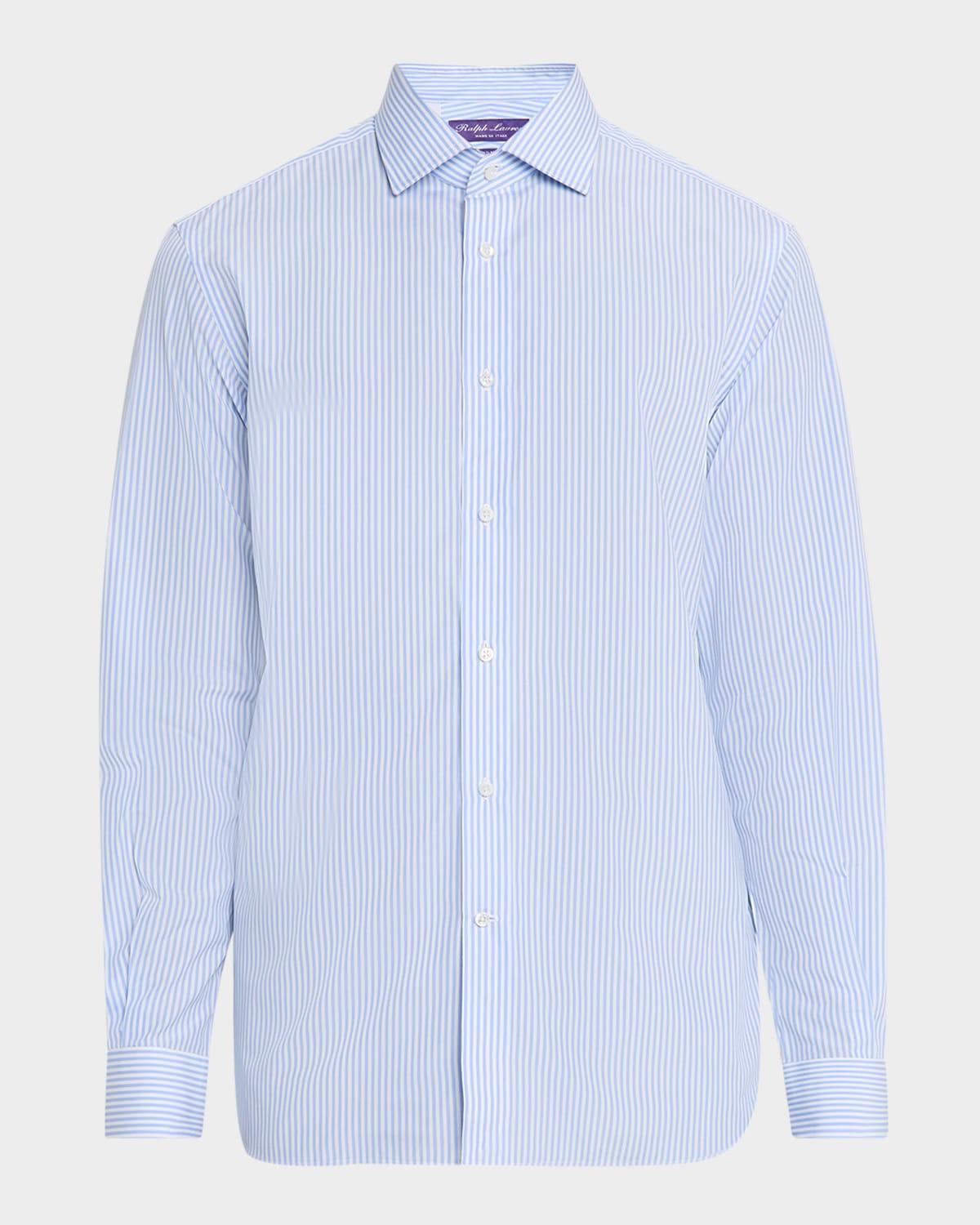 Ralph Lauren Purple Label striped sport shirt handcrafted with 120squality, twoply cotton Approx. 31.5L from shoulder to hem Classic widespread collar; 3 point length and 5 spread Signature collar stays Buttoned placket Long sleeve; approx. 35.5L Buttoned barrel cuffs Genuine motherofpearl buttons Split pleated back yoke ensures smooth, contoured shoulders Unlined Machine wash Made in Italy