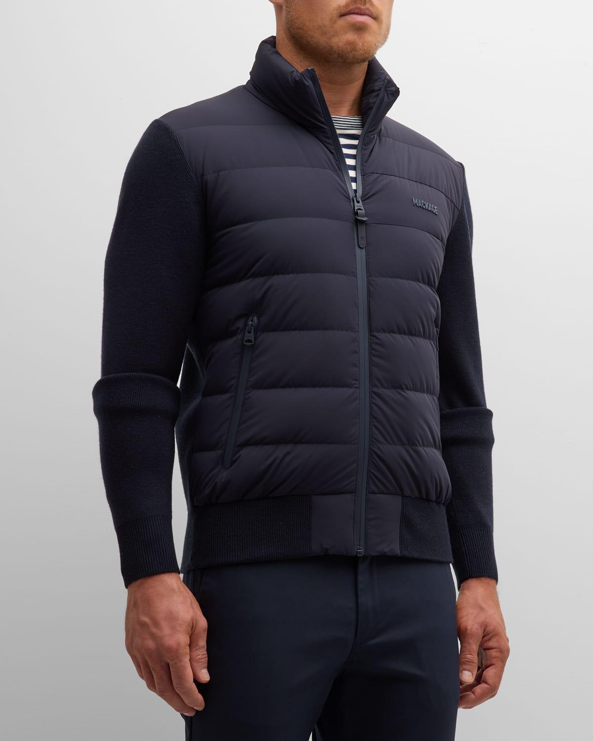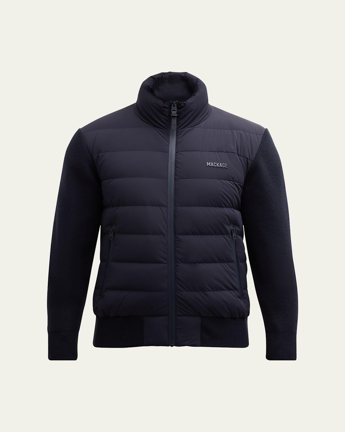 Mackages Haney City hybrid jacket features a cardigan silhouette filled with lightweight down and is crafted of Agile-360 two-way stretch material with a center front zip closure, welt pockets with a zipper opening. A signature logo at the chest adds subtle eye-catching detail while rib-knit trim makes for movement and comfort. Stand collar Long sleeves Welt pockets Rib-knit trim Zipper front 82% nylon/18% elastane Contrast: 42% wool/42% acrylic/14% polyester/2% elastane Fill: 90% washed goose down/10% goose feathers Machine wash Imported SIZE & FIT About 26.5 from shoulder to hem Model measurements: 62 tall, chest 40, waist 31 Model is wearing a US size 40. Mens Modern Coll & Outer - Contemporary Outerwear > Mackage > Saks Fifth Avenue > Barneys. Mackage. Color: Black. Size: XL.