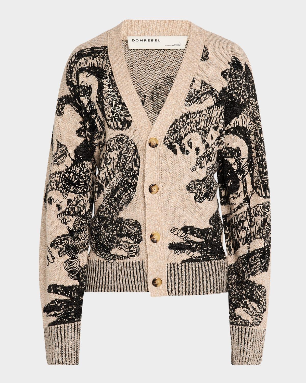 Domrebel Hao jacquard cardigan sweater featuring original drawings and embroideries throughout Handstitched logo along neckline VNeck Button closure Relaxed fit Long sleeves Ribbed cuffs and hem Acrylic/nylon/polyamide/wool Dry clean Imported