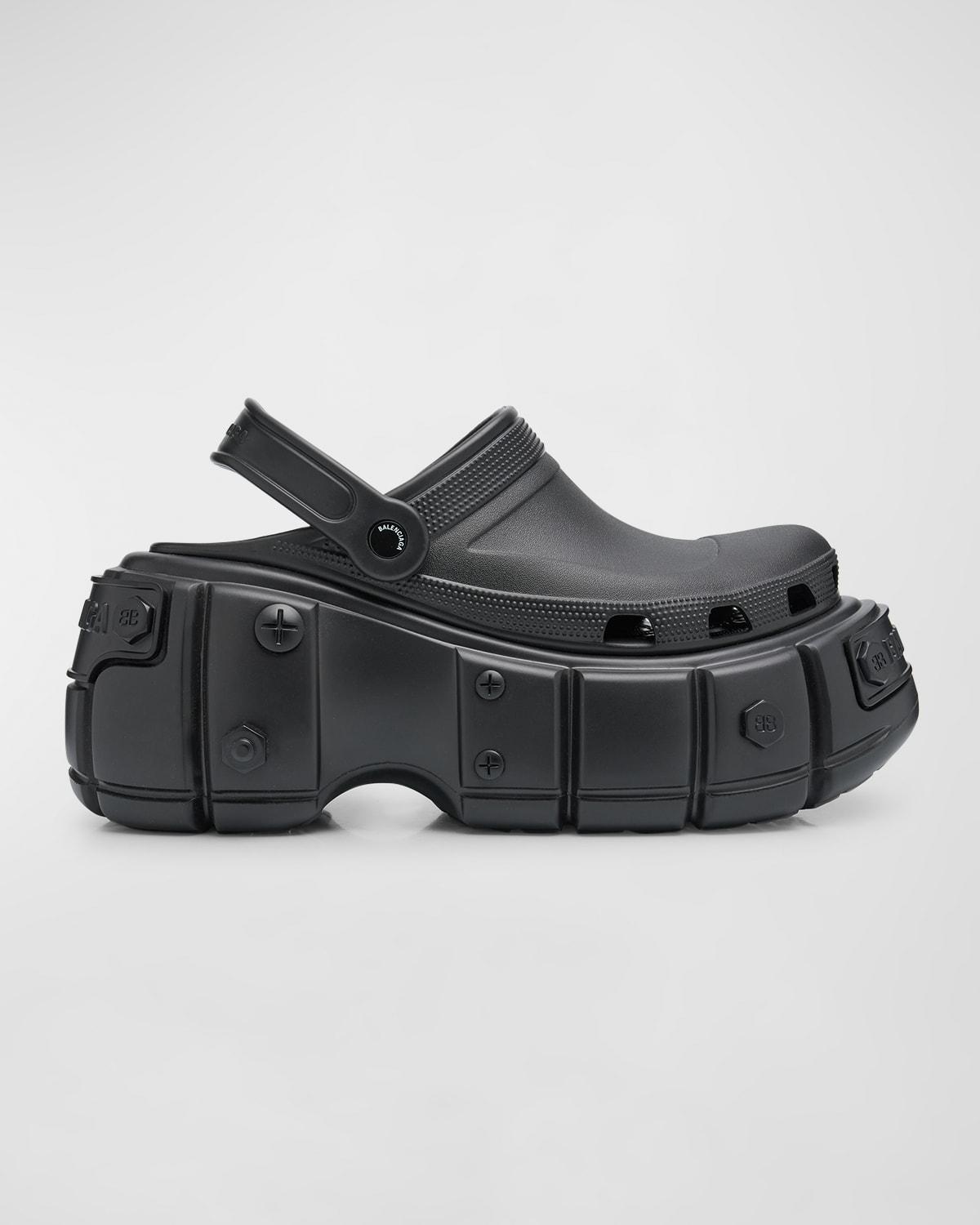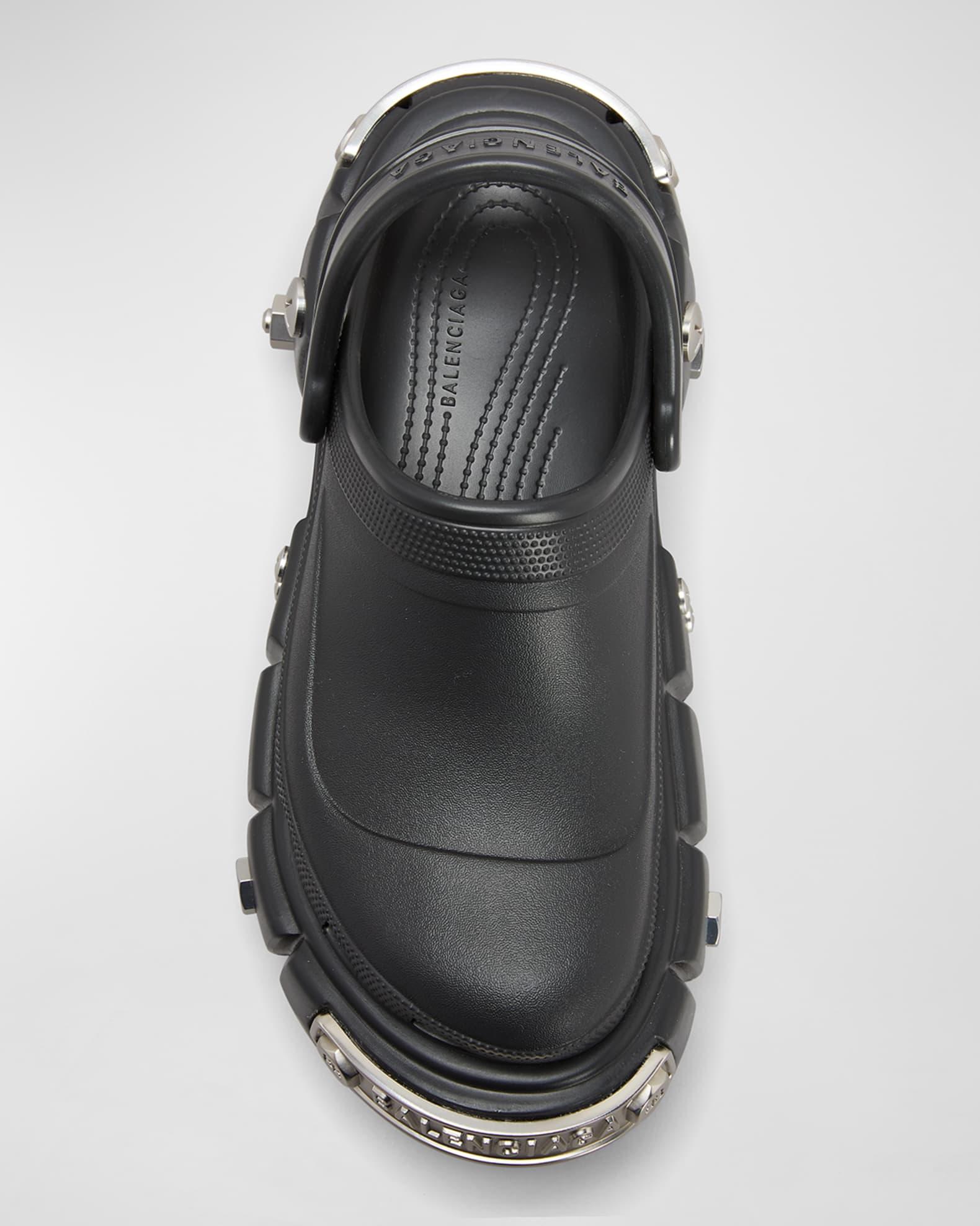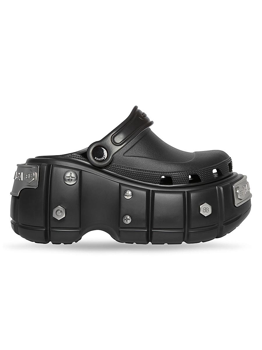 HardCrocs Sandals in rubber. Rubber Sandals Round toe Balenciaga logo debossed on strap Balenciaga logo debossed on silver metal piece effect at front and back BB logo engraved on studs Tone-on-tone sole and insole Imported Crocs collaboration Wipe with a soft cloth SIZE 10mm arch 110mm platform. Lsd Rtw - Balenciaga Rtw > Balenciaga > Saks Fifth Avenue > Barneys. Balenciaga. Color: Black Silver. Size: 6.
