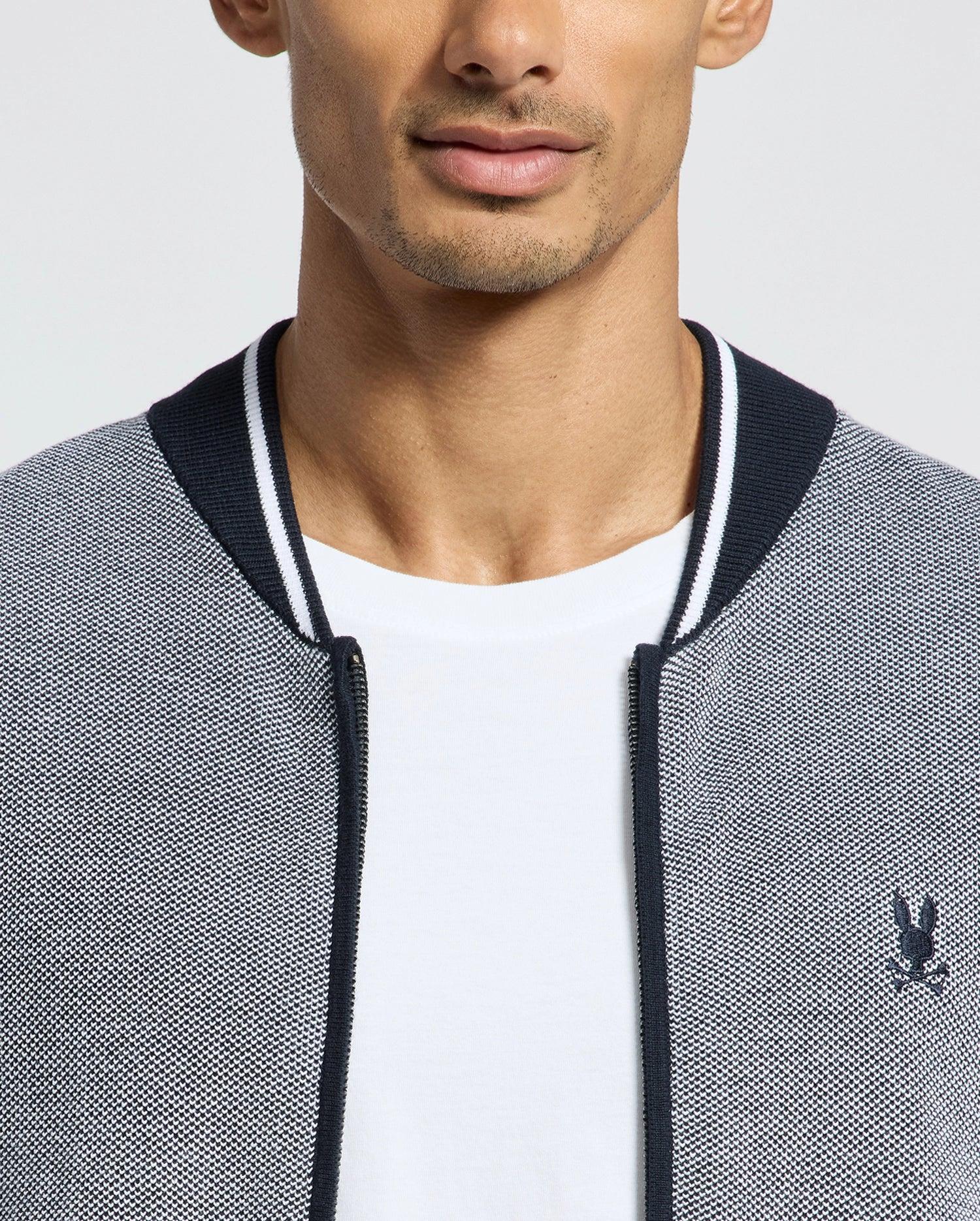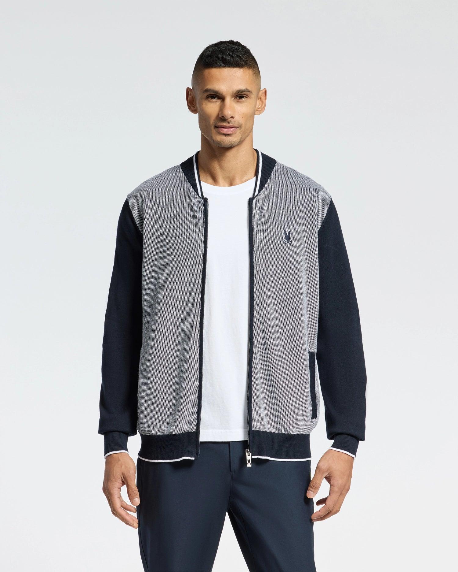 Command attention and guarantee comfort with a classic silhouette and subtle embroidery in a 100% cotton knit. Bunnies away!100% CottonColorblockedEmbroiered chest BunnyZip closureZip pocketsContrast rib tipping Front contrast panel in 2 colour birdseye stitchModel height is 6'2 (approx. 188cm) and is wearing a size medium.