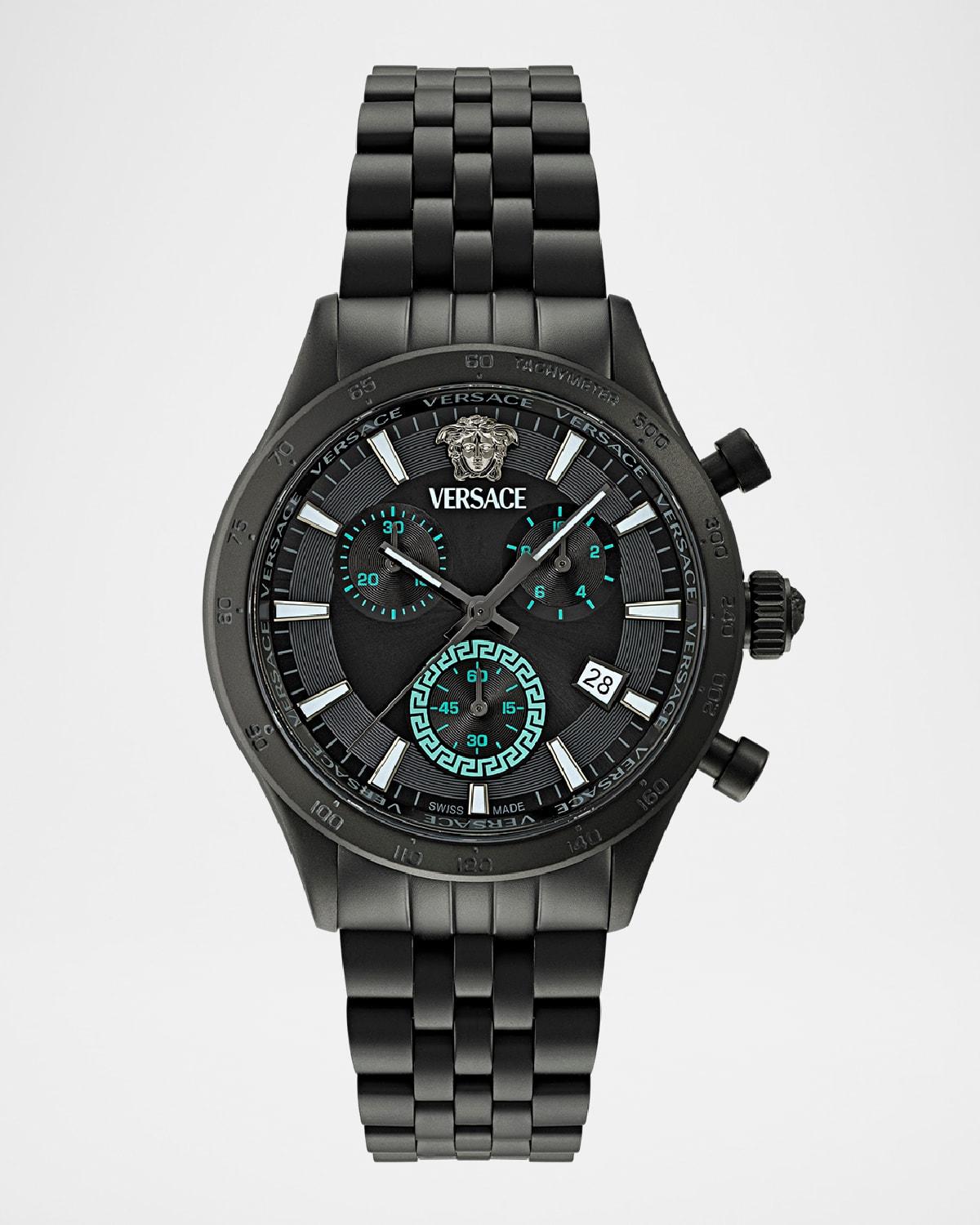 Versace Hellenyium mens bracelet watch 40mm; round IP black stainless steel case Sapphire crystal glass Tachymeter bezel Black sunray dial; three subdials Logo at 12 oclock Date window at 4 oclock Fivelink IP black bracelet Deployant buckle Water resistant at 5 ATM Quartz movement Spot clean Made in Switzerland